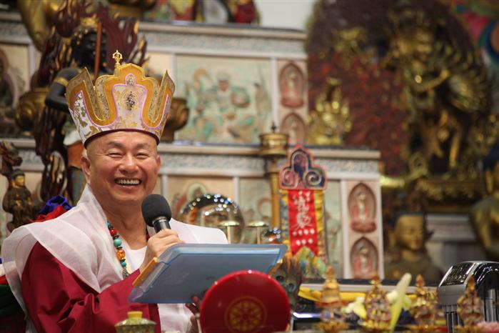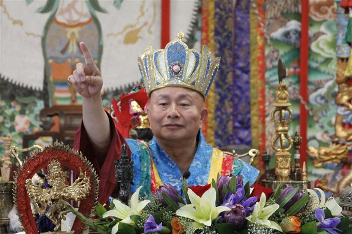 我們敬禮了鳴和尚、薩迦證空上師、十六世大寶法王噶瑪巴、吐登達爾吉上師,敬禮壇城三寶、敬禮真佛宗傳承法流毗盧遮那佛、佛眼佛母、阿彌陀佛、蓮花童子,敬禮諸佛菩薩、金剛、護法、空行、諸天。師母,各位上師、教授師、法師、講師、助教、堂主,各位同門,還有網路上的同門,另外還有我們圖書館的同門,今天我們有尊貴的蒞臨,貴賓──華盛頓州州首席檢查長。我們祝福他將來一帆風順,一切順利。另外我們的廖大使跟大使夫人,還有Miss TERESA今天也有來,她是我們真佛宗的大掌櫃,管財務,她幫忙很多。