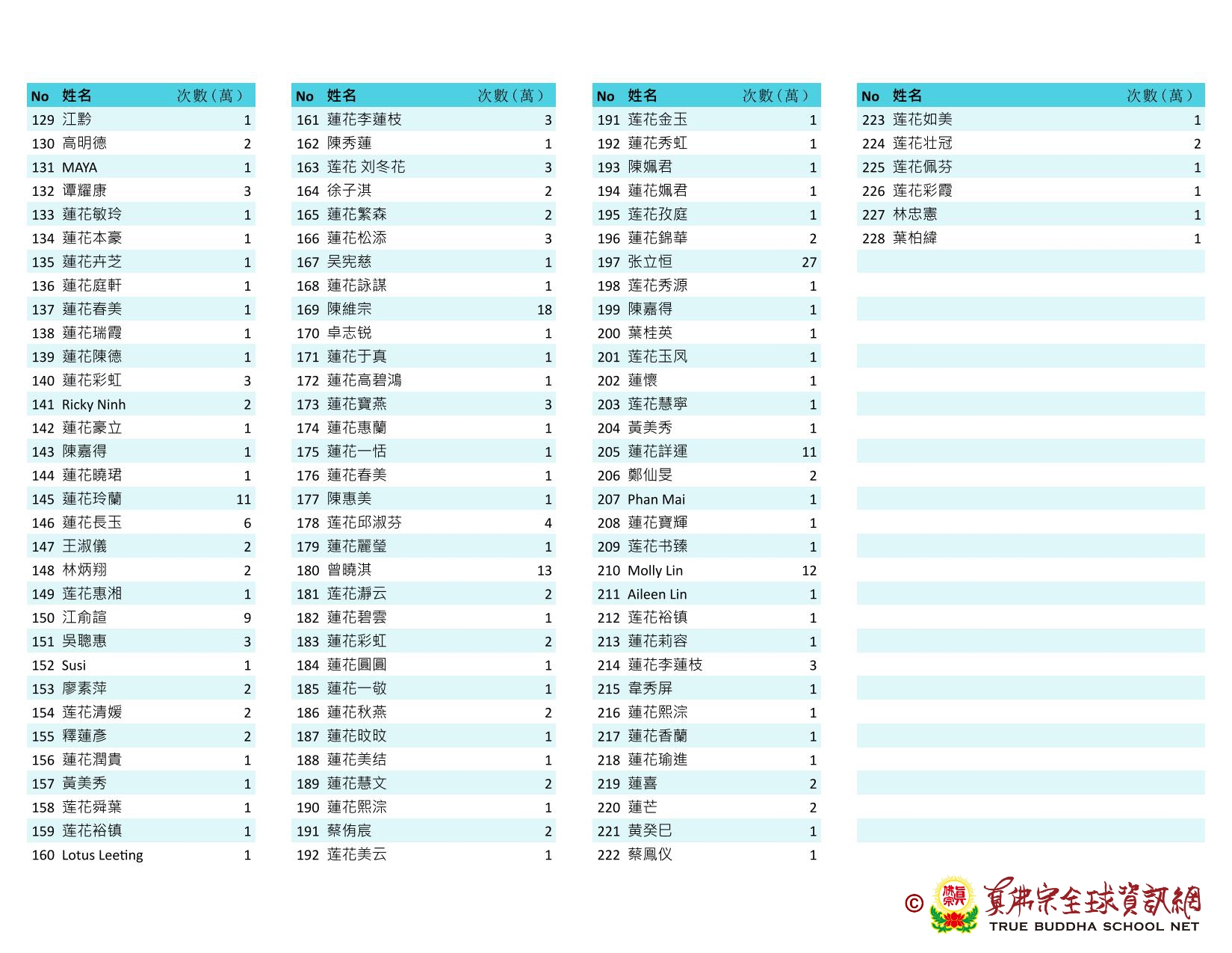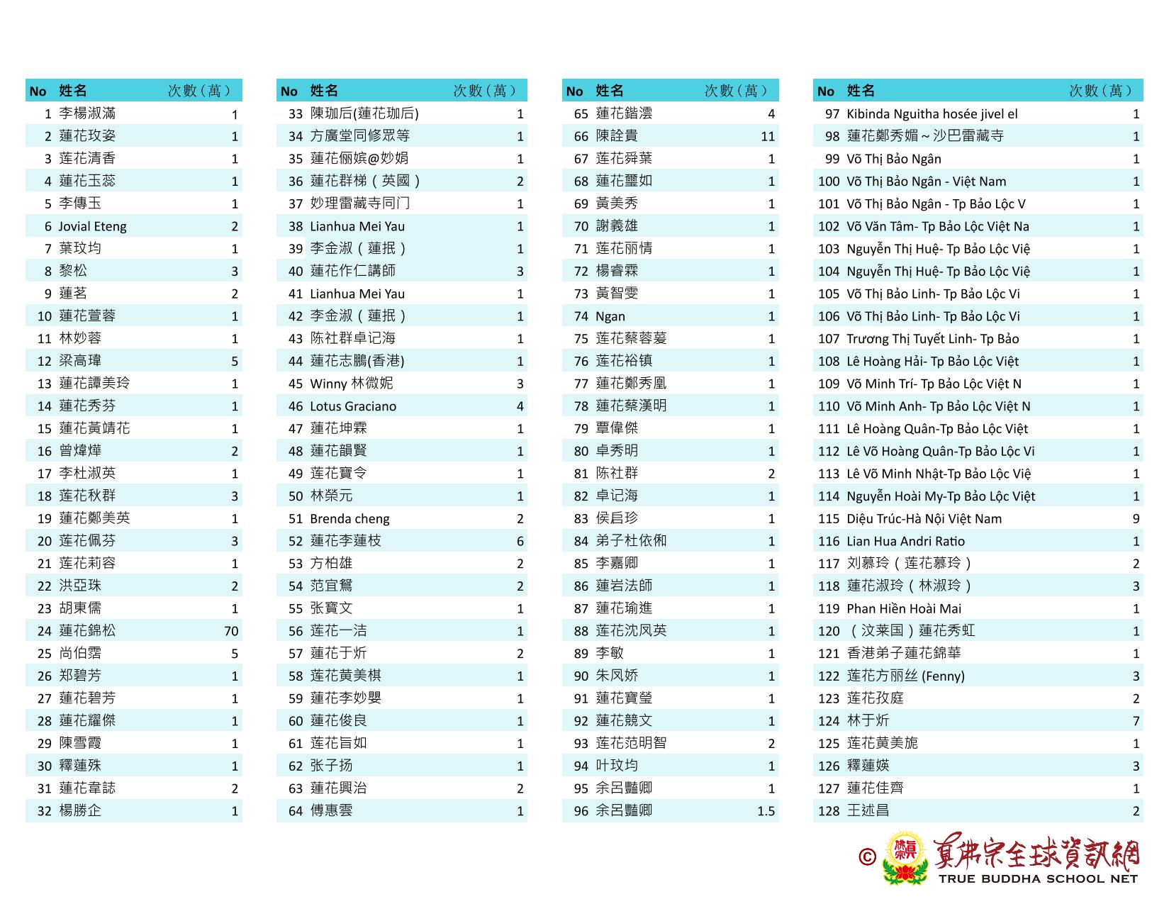 持誦金母心咒迴向師佛 全球真佛弟子一心持誦瑤池金母心咒 祈求瑤池金母大天尊光明守護師佛。 截至2025/4/12日中午,持誦瑤池金母心咒累積數目已達五百一十一萬五千遍,在此呈上目前所登記於真佛宗全球資訊網TBSN的名單。 感謝所有持咒迴向的同門!讓我們再接再厲,以千萬遍金母心咒,向慈悲的無極瑤池金母大天尊祈求,集氣迴向 師佛安康無恙,自在任運! 持咒登記處: https://ch.tbsn.org/event/blessing2025