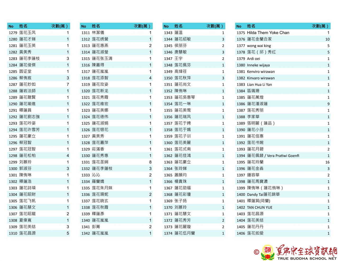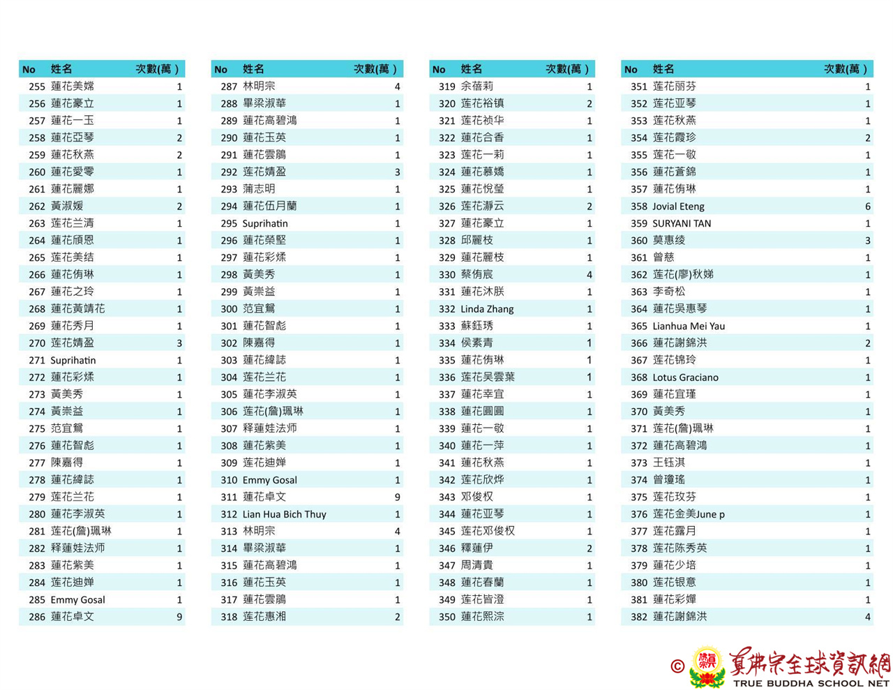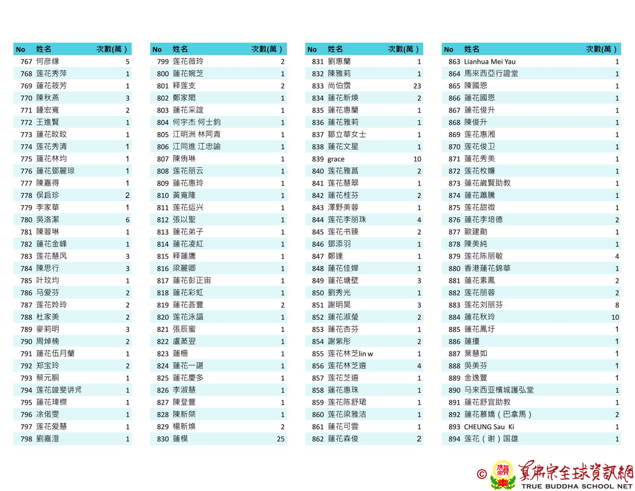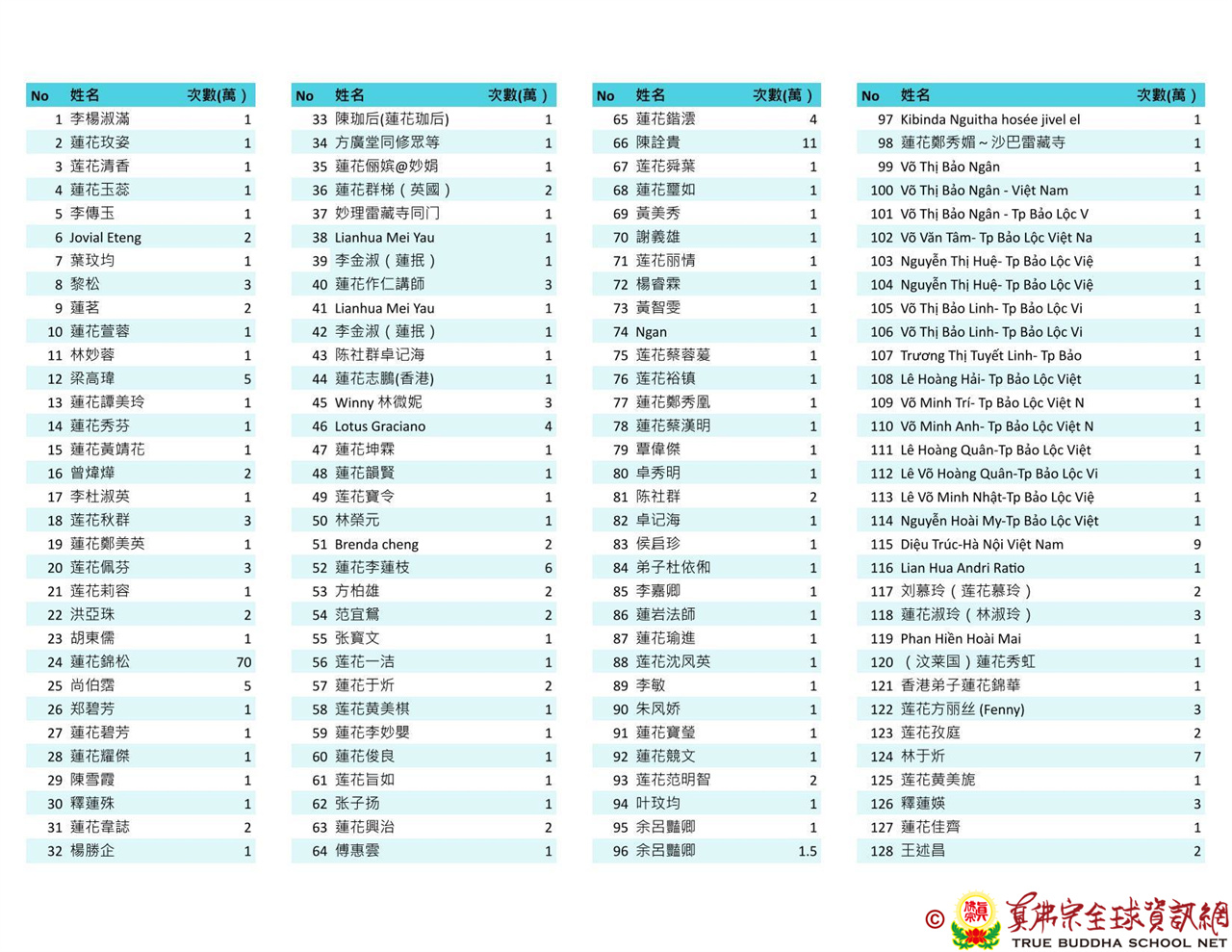持誦金母心咒迴向師佛 全球真佛弟子一心持誦瑤池金母心咒 祈求瑤池金母大天尊光明守護師佛。 截至2025/05/04日下午,持誦瑤池金母心咒累積數目已達4028萬遍,在此呈上目前所登記於真佛宗全球資訊網TBSN的名單。 感謝所有持咒迴向的同門!讓我們再接再厲,以千萬遍金母心咒,向慈悲的無極瑤池金母大天尊祈求,集氣迴向 師佛安康無恙,自在任運! 持咒登記處: https://ch.tbsn.org/event/blessing2025