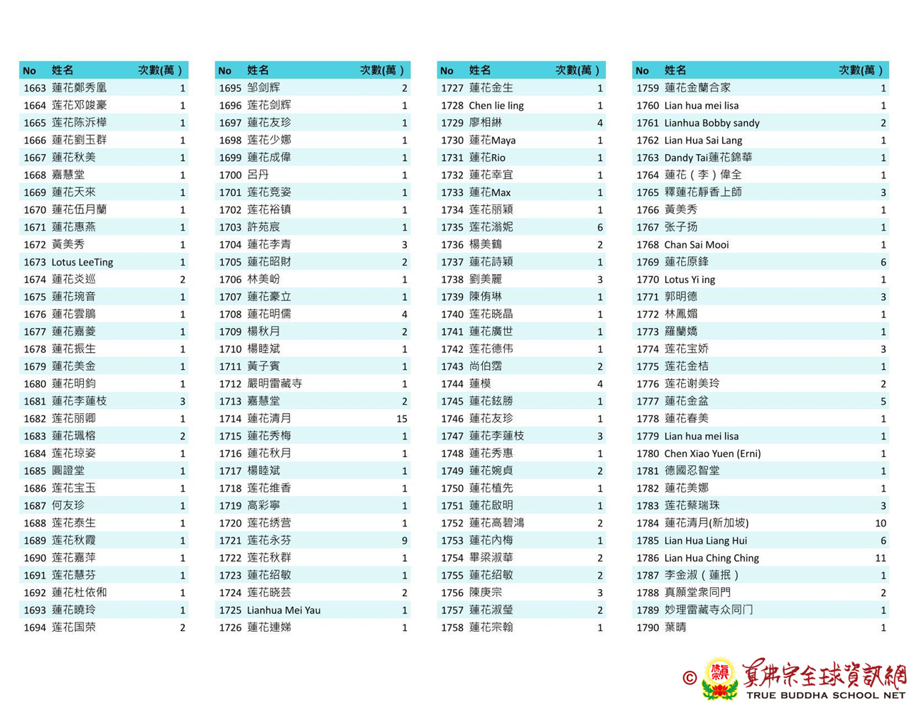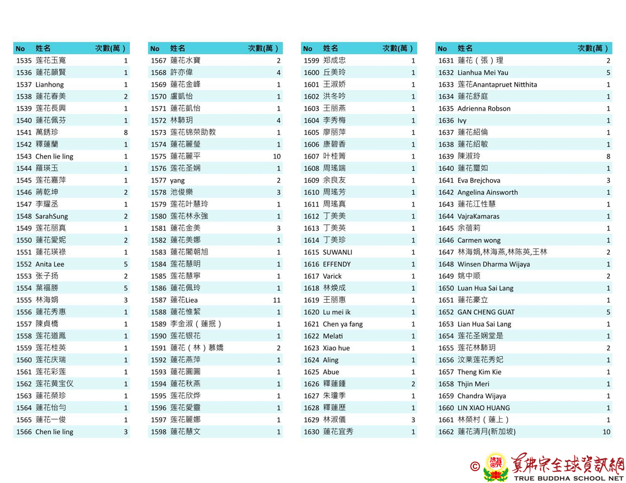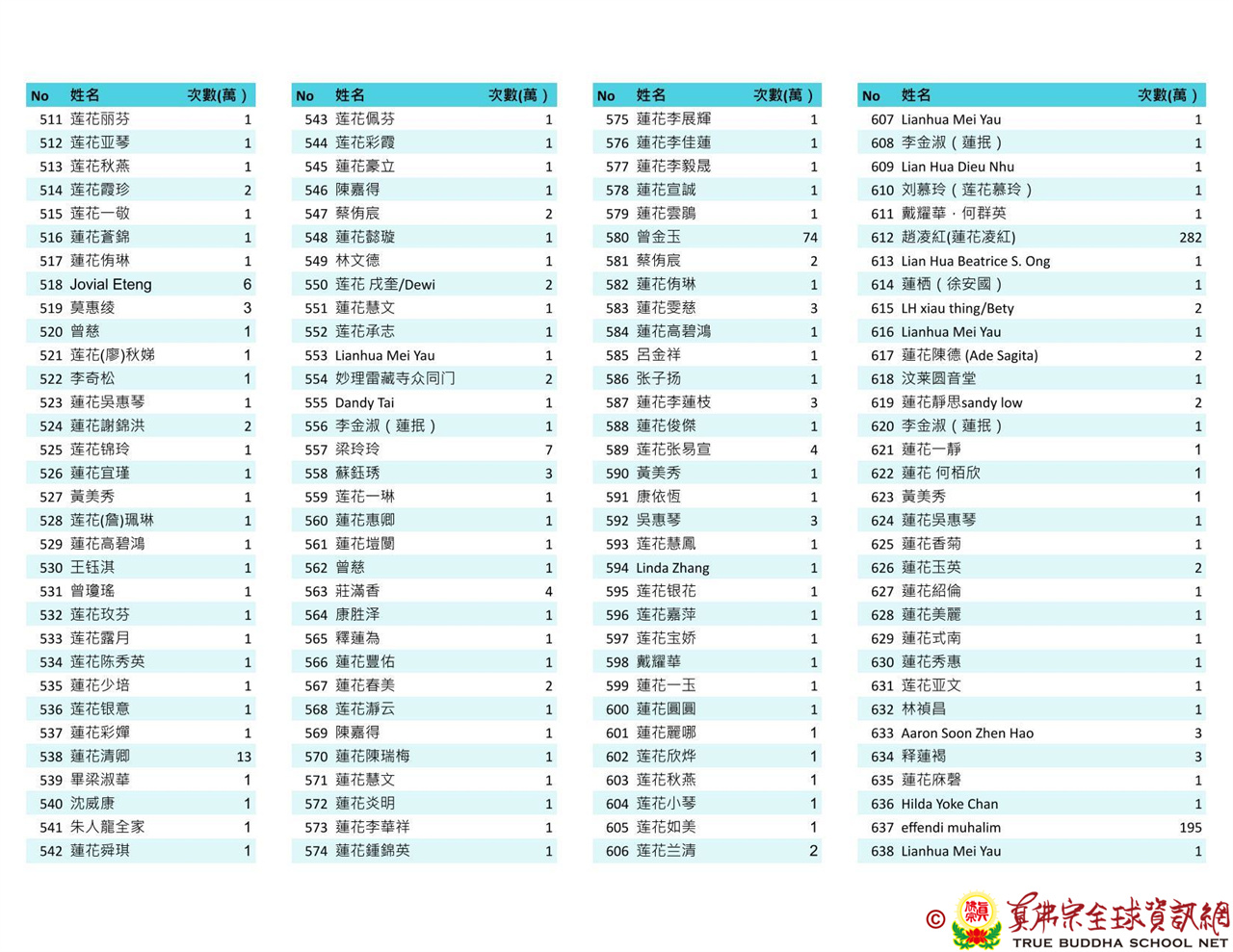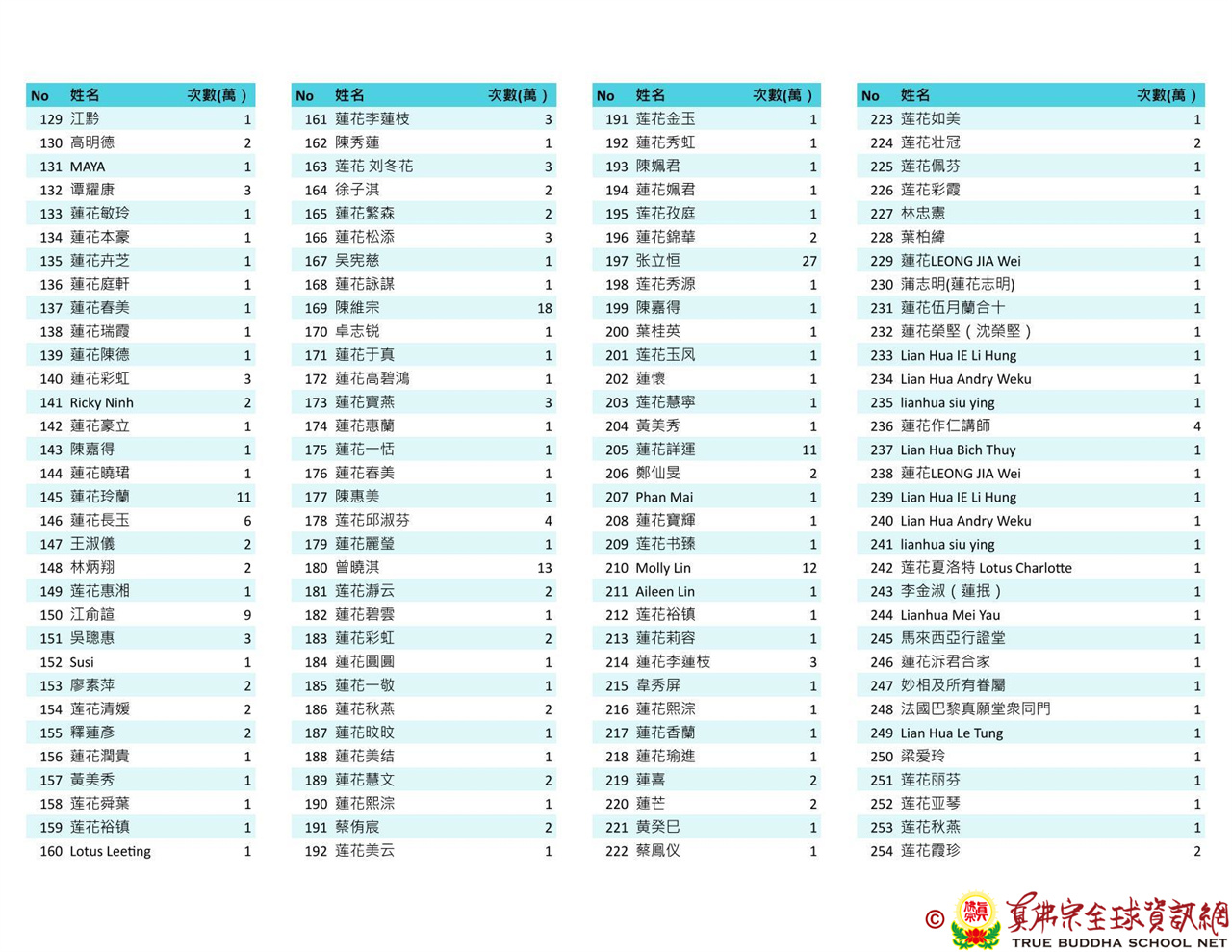 持誦金母心咒迴向師佛 全球真佛弟子一心持誦瑤池金母心咒 祈求瑤池金母大天尊光明守護師佛。 截至2025/05/04日下午,持誦瑤池金母心咒累積數目已達4028萬遍,在此呈上目前所登記於真佛宗全球資訊網TBSN的名單。 感謝所有持咒迴向的同門!讓我們再接再厲,以千萬遍金母心咒,向慈悲的無極瑤池金母大天尊祈求,集氣迴向 師佛安康無恙,自在任運! 持咒登記處: https://ch.tbsn.org/event/blessing2025