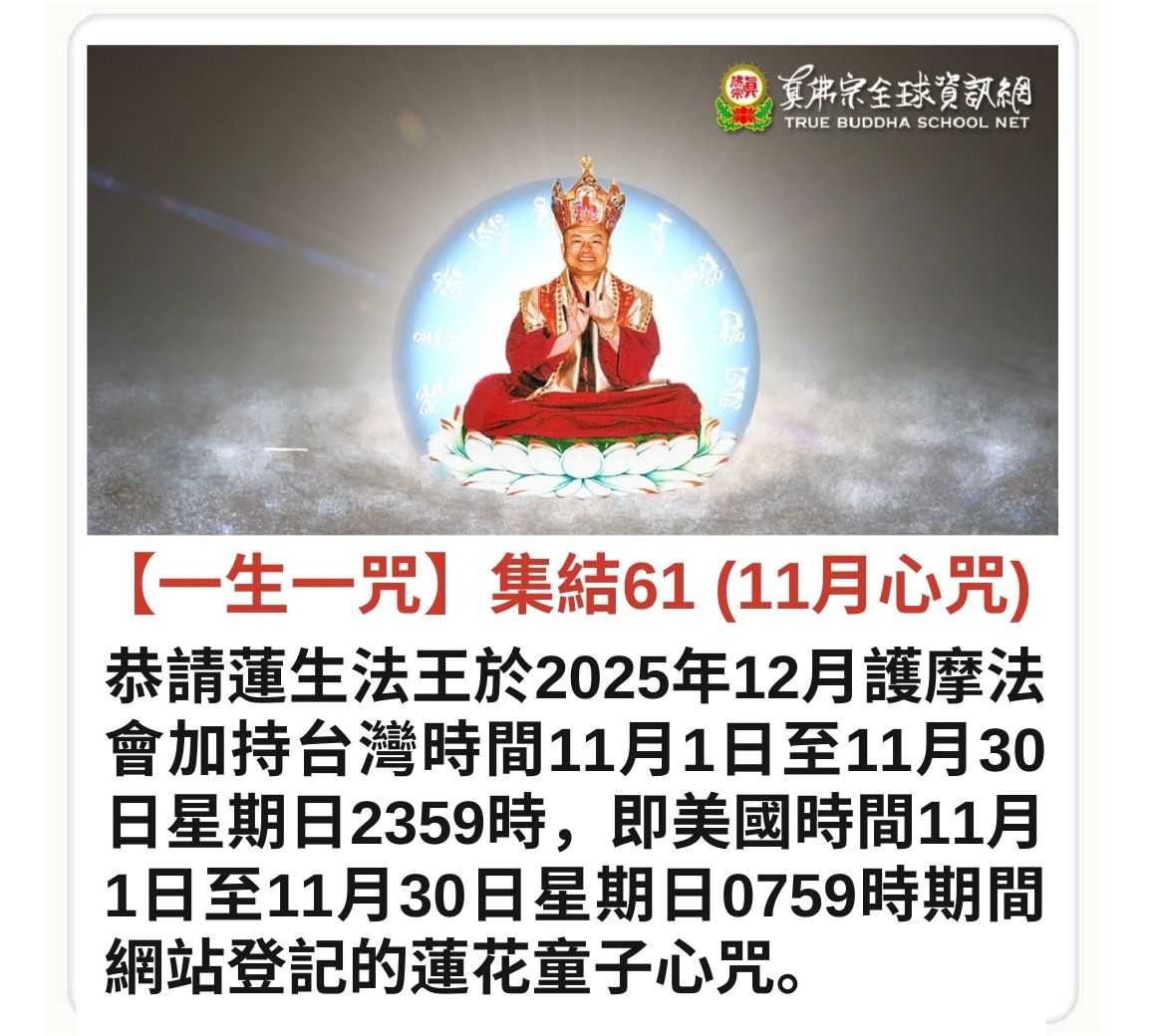宗委會將於2025年12月收集接下來的蓮花童子心咒,在12月護摩法會呈交師尊加持。(台灣時間11月1日至11月30日星期日2359時,即美國時間11月1日至11月30日星期日0759時期間登記的心咒)