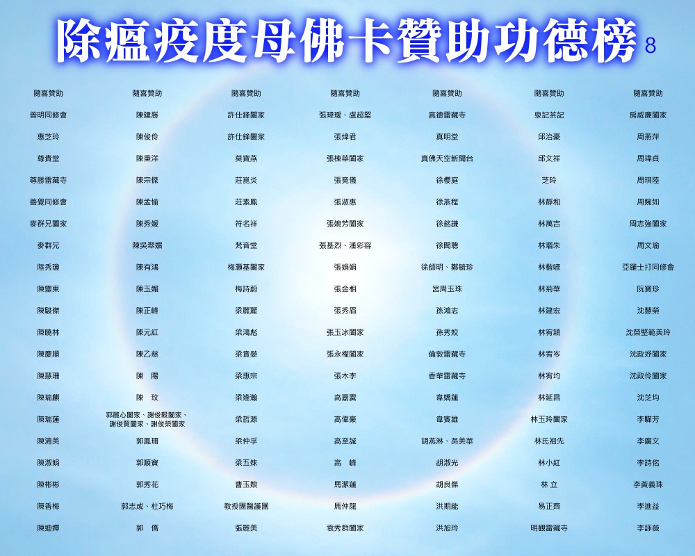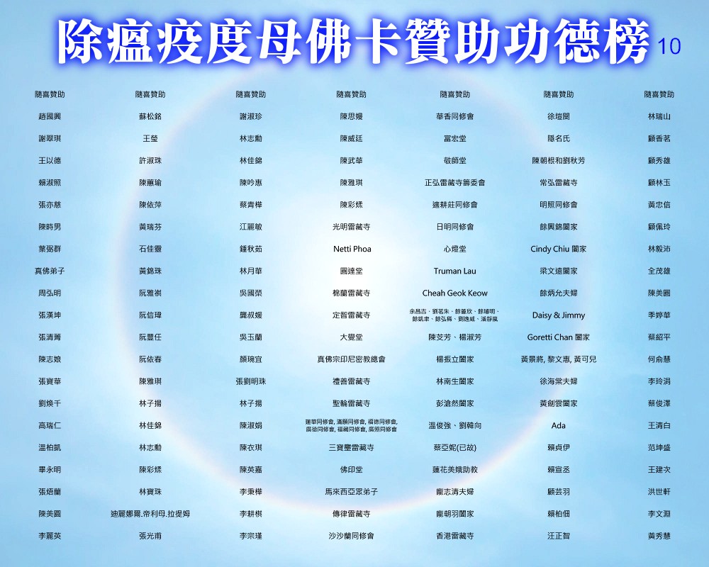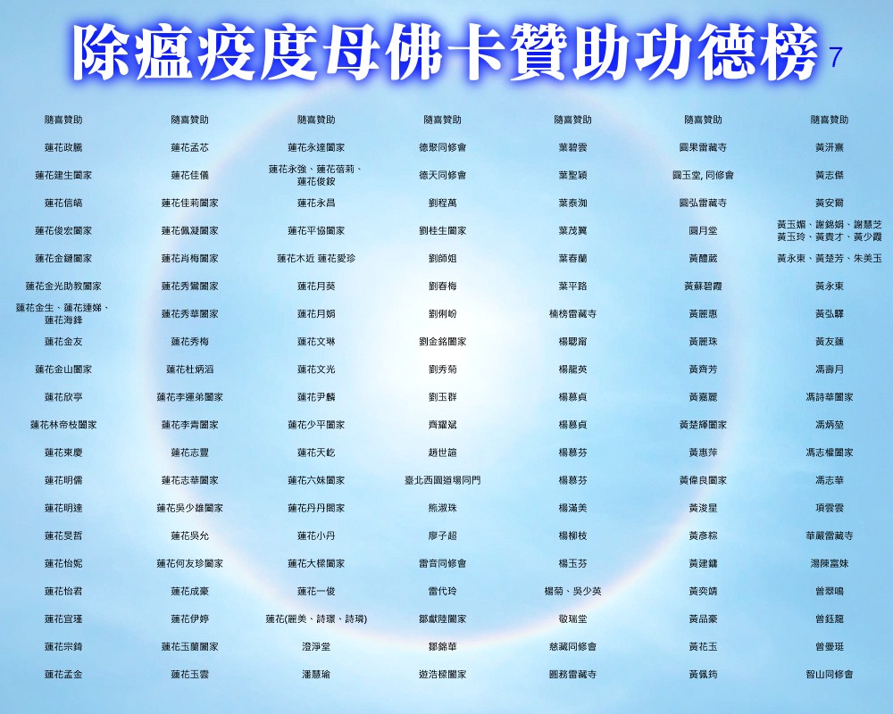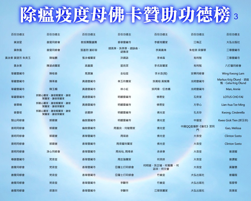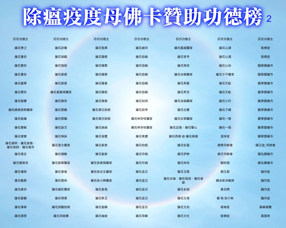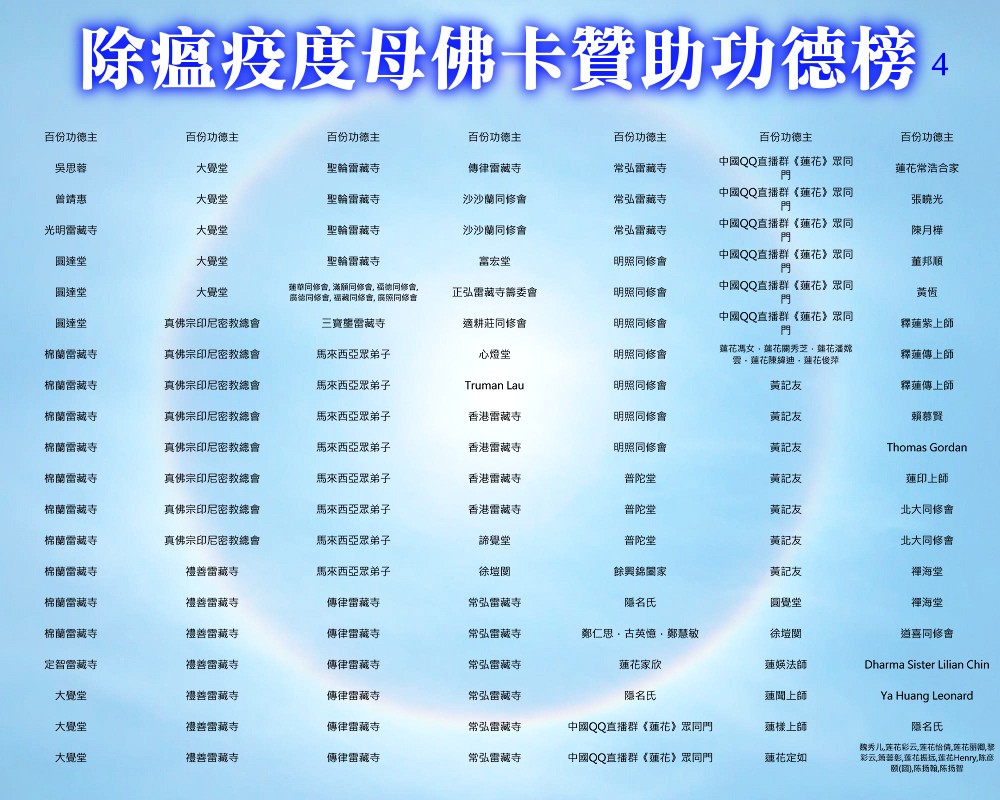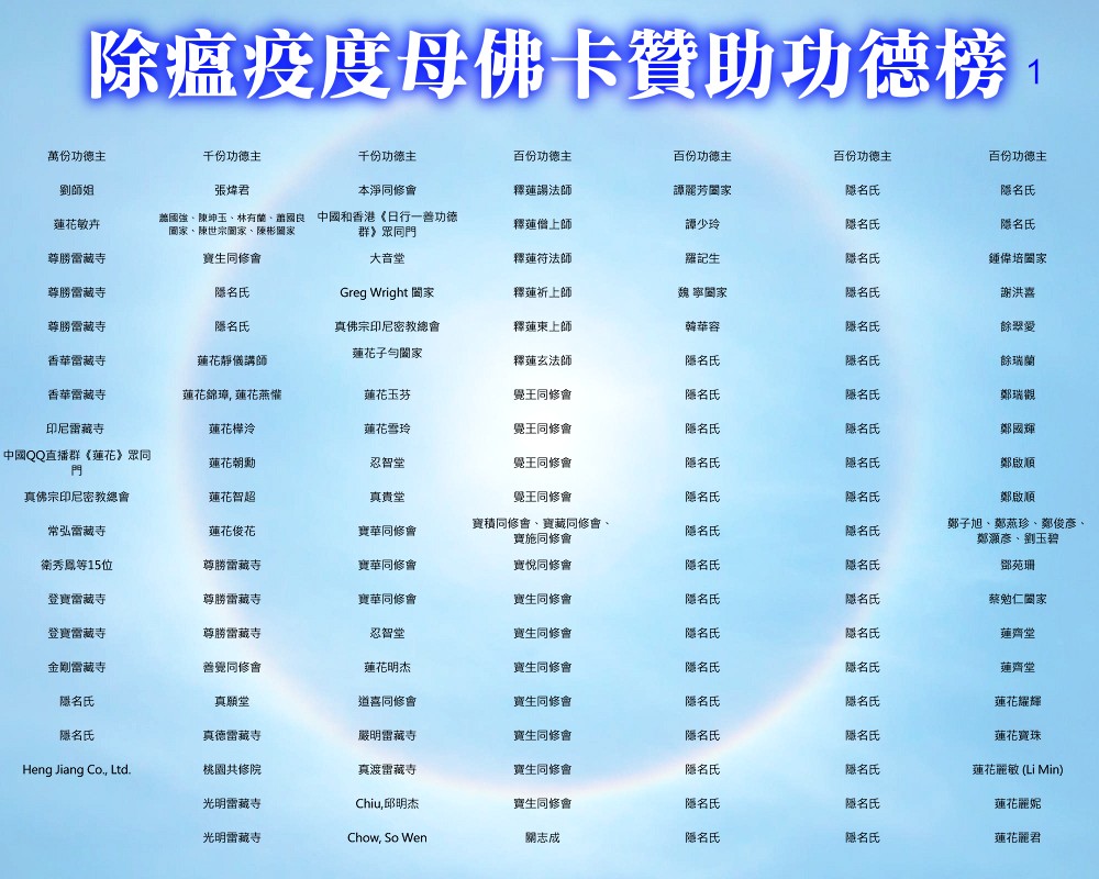 【除瘟疫度母佛卡贊助功德榜】 宗委會感恩諸位善信大德贊助印製「除瘟疫度母」佛卡! 在人心惶惶的疫情中,經由真佛宗根本傳承上師加持的「除瘟疫度母」佛卡令人倍增信心,卡中的「避疫病符」令人安心。持誦除瘟疫度母心咒或修除瘟疫度母念誦法時,法相更有助於觀想。 一張佛卡不僅是一張佛卡,祂既充滿了傳承加持力,充滿了師佛對弟子的疼惜和關懷,也滿載著功德主們的愛心。 宗委會再次對眾功德主表達衷心的感謝!功德無量!利益眾生! 世界真佛宗宗務委員會 合十