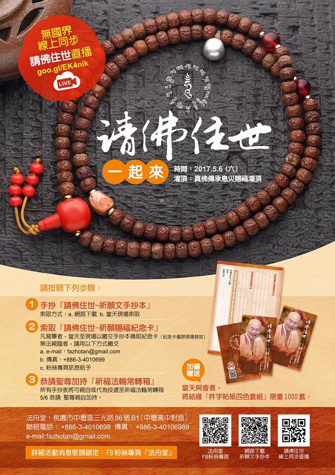 蓮生活佛 盧勝彥法王於5月6日(星期六)PM 15:00 親臨桃園法舟堂開光安座及賜授「真佛傳承息災賜福灌頂」
