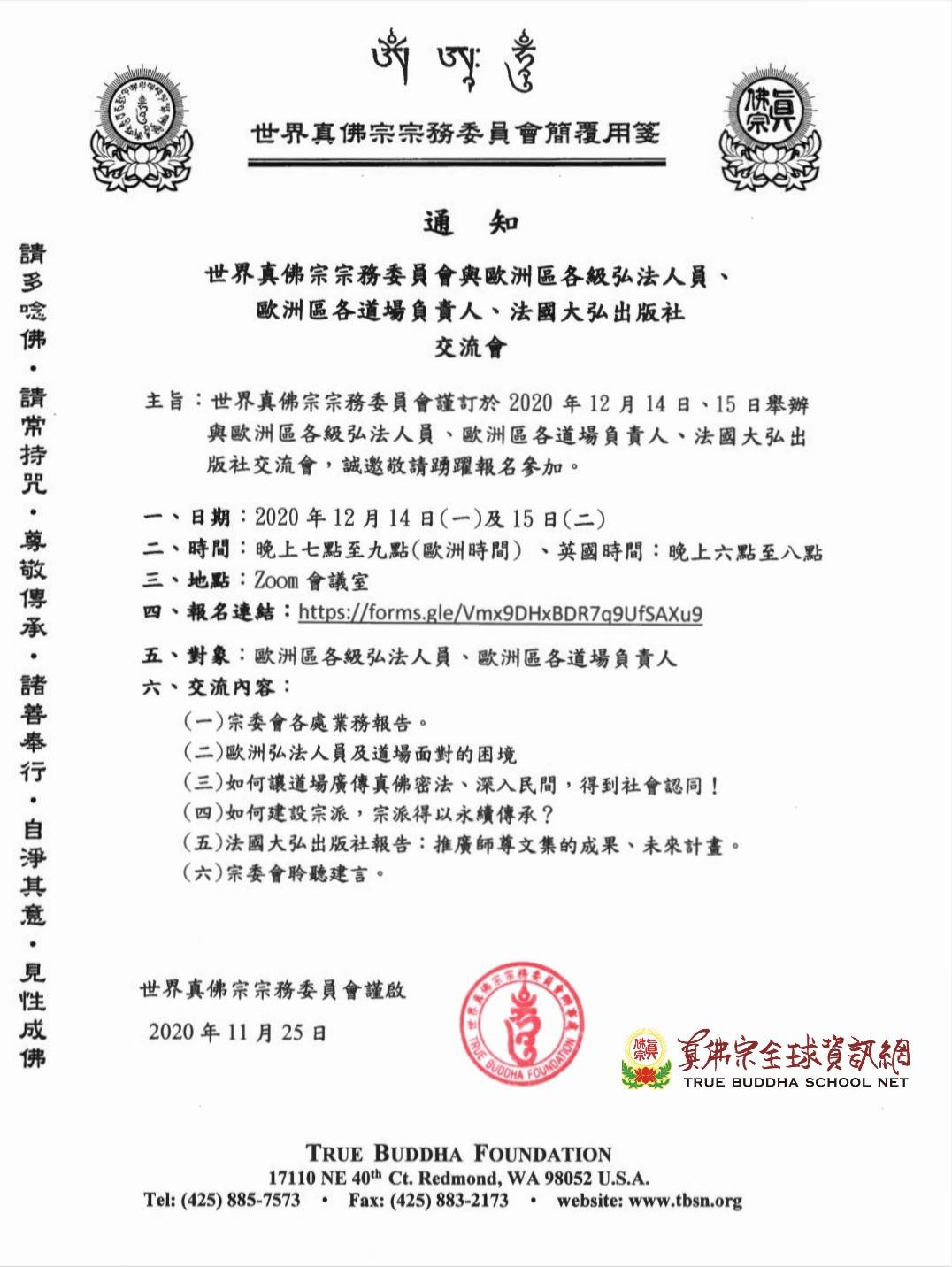主旨:世界真佛宗宗務委員會謹訂於2020年12月14日、15日舉辦與歐洲區各級弘法人員、歐洲區各道場負責人、法國大弘出版社交流會,誠邀敬請踴躍報名參加。