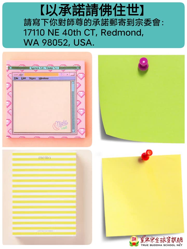 宗委會呼籲大家,以自己的方式,在「心願卡」上寫下自己對師尊的承諾和請佛住世的心願,以承諾請佛住世,並親自將卡片寄到西雅圖真佛密苑給師尊,讓師尊看見我們的心意。