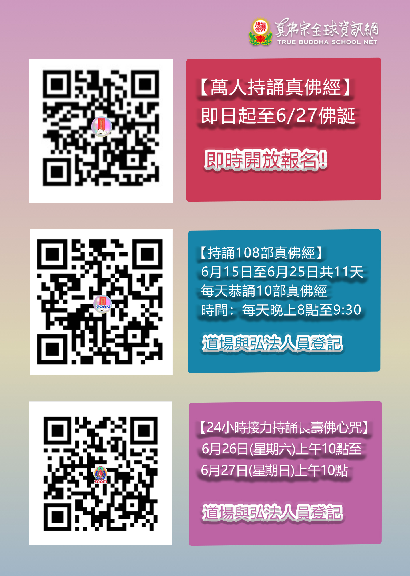 即日起,歡迎您參加萬人持誦108部真佛經活動!您可個人或在道場持誦、參加以下直播一起持誦、看回播跟著持誦,隨時隨地持誦,在台灣時間6月27日佛誕持滿108部真佛經。