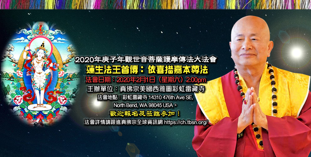 真佛宗美國西雅圖彩虹雷藏寺將於2020年2月1日舉辦庚子年觀世音菩薩護摩傳法大法會,大會恭請根本傳承上師聖尊蓮生活佛親臨主壇護摩法會,並首傳依喜措嘉本尊法!