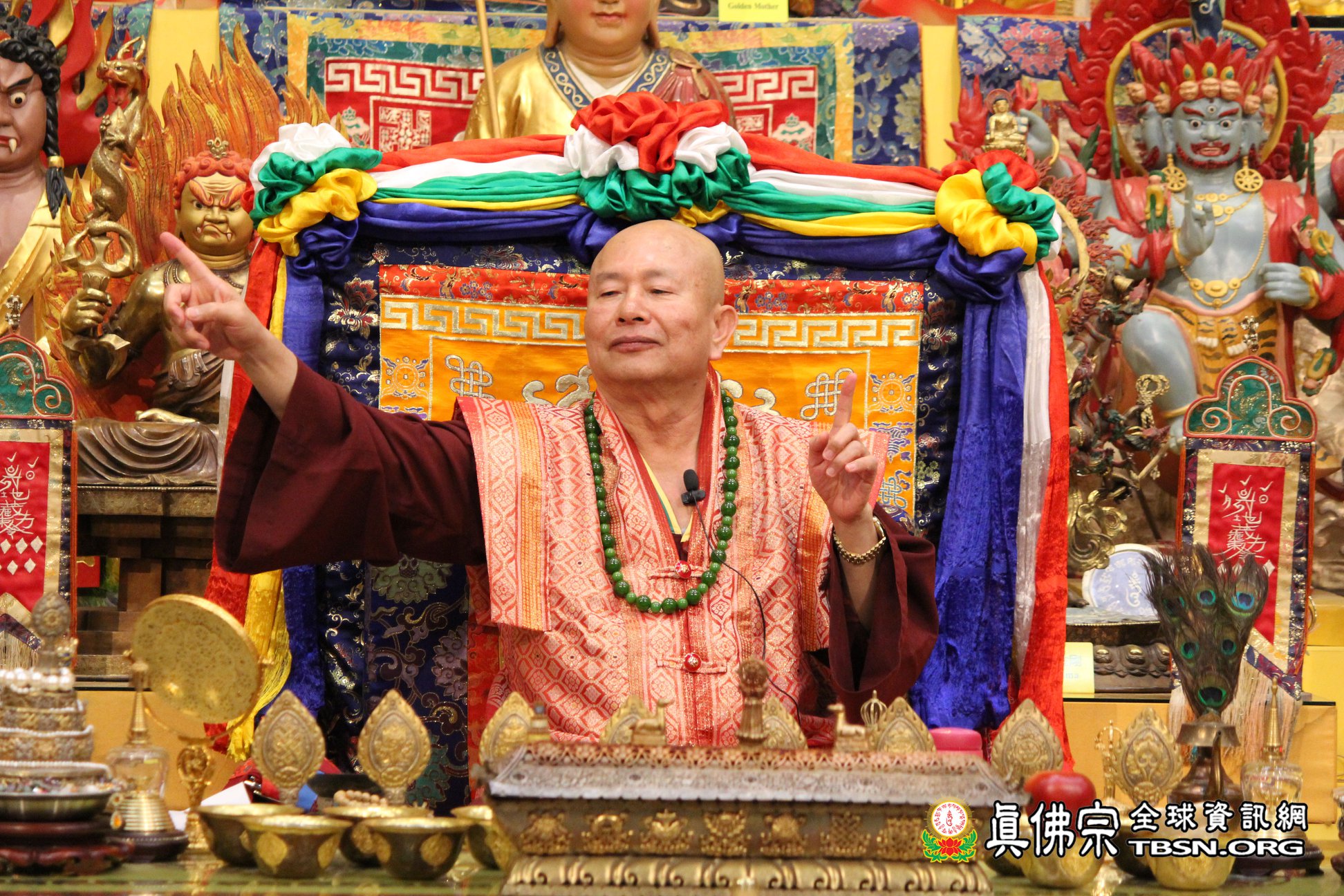 乘著夕陽餘暉,習習的晚風吹拂,師尊、師母共同連袂出席祖廟今晚蓮華生大士本尊法的同修活動。在佛光加持、莊嚴圓滿的修法結束後,聖尊談到同修本尊蓮華生大士在藏地裡,是紅、黃、白、花四個教派都共同尊崇的偉大的菩薩,祂也是最早進入西藏弘法的大成就者。因為祂本身有很大的神通力,把苯波教(黑教)所有的神祇、鬼神降伏,使祂們變成密教的護法,及護持佛教的神。