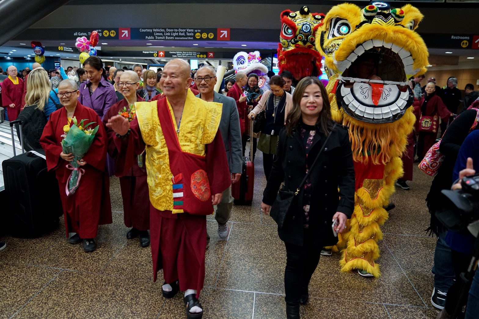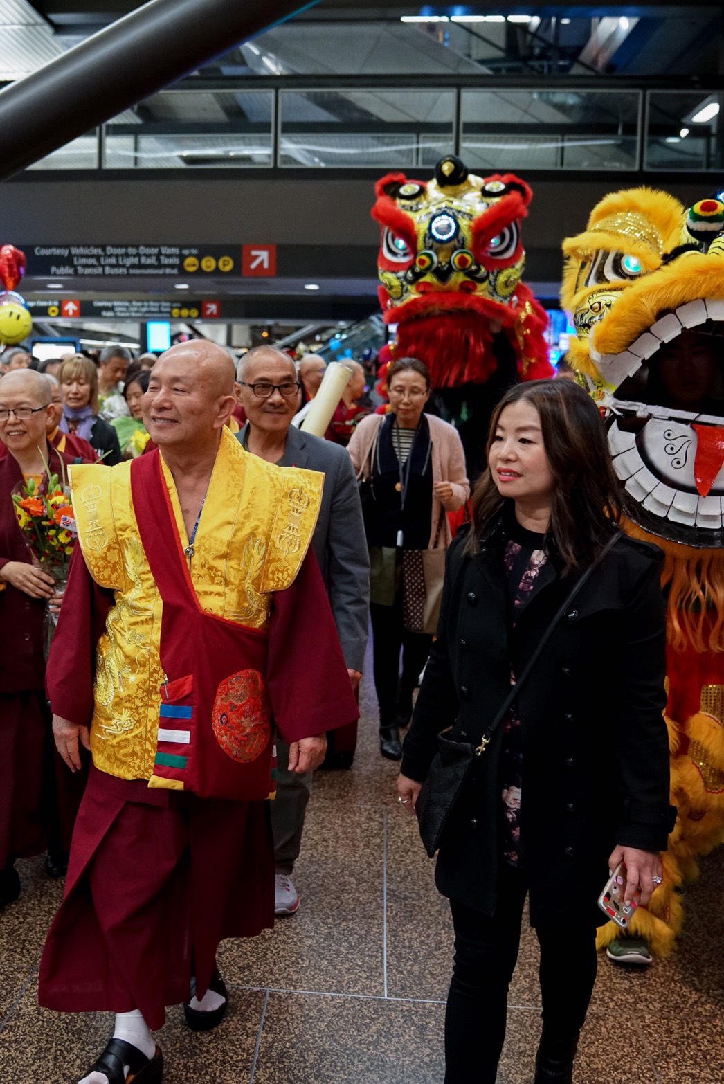 當聖尊蓮生活佛 盧勝彥暨師母蓮香金剛上師的身影在手扶梯的一端出現時,與會所有人歡欣鼓舞,歡迎布條映入眼簾,現場搭配著舞龍舞獅在在的顯示美加弟子的思念與期盼!在思念的笑容與淚水互相輝映交織下。