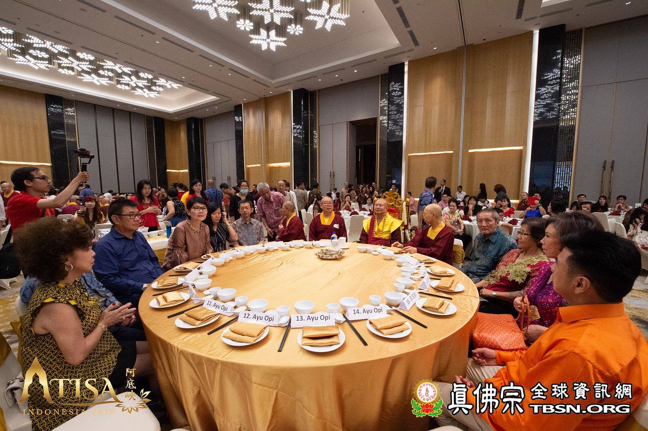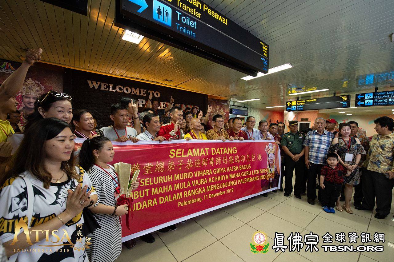 2018年12月11日印尼巨港聖輪雷藏寺迎師宴 【TBSN報導】 2018年12月11日,聖尊一行人抵達印尼巨港。在機場,有聖華堂及聖輪雷藏寺同門來迎師。當晚聖輪雷藏寺設宴歡迎聖尊。除了傳統歌舞,有兩位師姐獻唱了《感恩師尊》及《You Raise me up》,歌聲嘹亮動聽。 聖輪雷藏寺致詞感恩師尊到來印尼傳下阿底峽尊者法,也感謝主辦單位特別安排此行程,讓聖輪雷藏寺也有機會供養聖尊。 聖尊亦以虎虎生威的金剛棍加持弟子們,晚宴在愉悅的氣氛中結束。