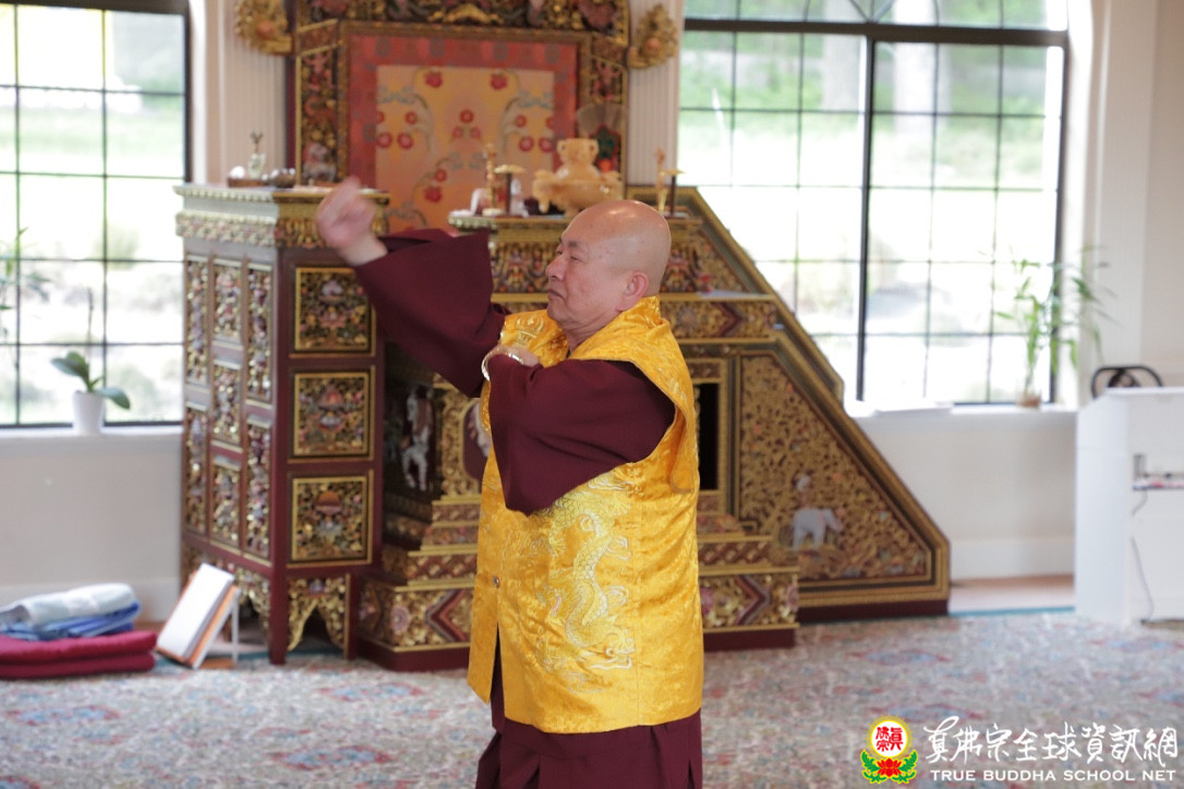 午時至,空中的王者在山莊上現身,兩隻英姿煥發的老鷹(黑鳶),隨熱氣流上升盤旋繞圈,其翱翔飛行姿態,流露自在優雅又威風的王者風範,宛如在展現護法的力與美。不久,熟悉的感應鈴聲響起,眾人期待的主角-法王蓮生活佛盧師尊和師母終於駕臨。一旁的工作人員獻上逞嬌呈美的鮮花,師尊一一領受並供養諸尊。一串白色明亮的珍珠唸珠,掛在師尊胸前,師尊說明如何分辨珍珠的真假,極具專業;一顆顆渾圓、晶瑩剔透的珍珠,恰似法王的如意摩尼寶珠,為大眾帶來光明吉祥。