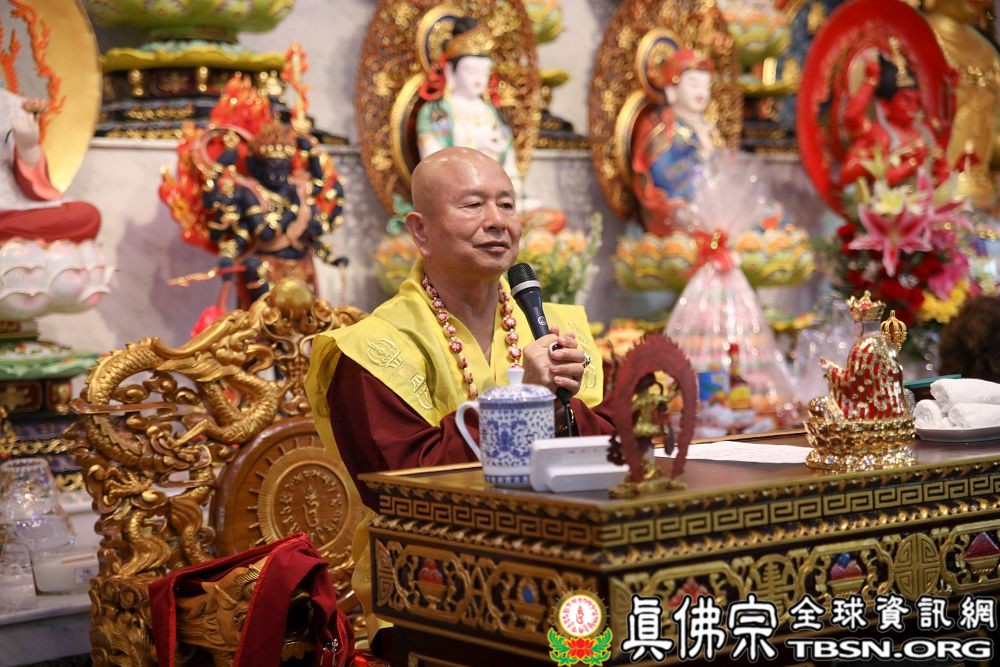 聖尊應邀開示:今天早上自己在飯店,由於窗簾沒有關,致令自己被晨陽照了整個早上,曬成了印尼人的臉,這句話令印尼同門聽了都笑開懷。聖尊覺得華雨雷藏寺十分莊嚴,每尊佛菩薩像都雕刻得很精美,他覺得道場靈氣非常重。此外,聖尊覺得這次大家都非常團結,真是殊勝。