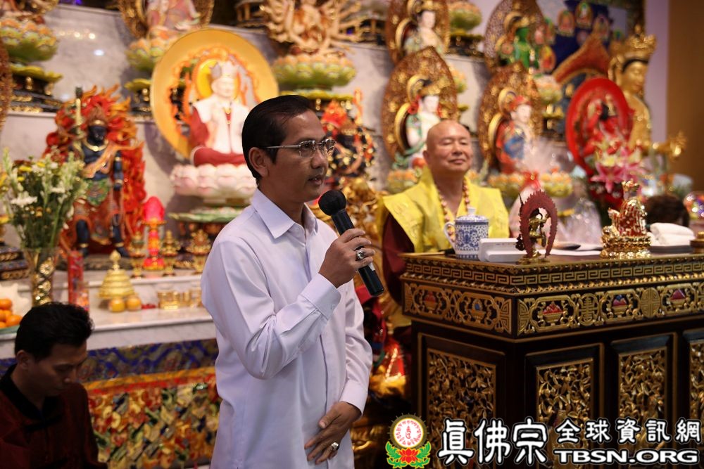 他感恩今天大家能夠相聚在此,非常感謝大家,特別感恩師尊。今天是非常具有歷史性的一刻,因為是西雅加達第一座雷藏寺開光。他感謝大家護持,請佛住世,永轉法輪。
