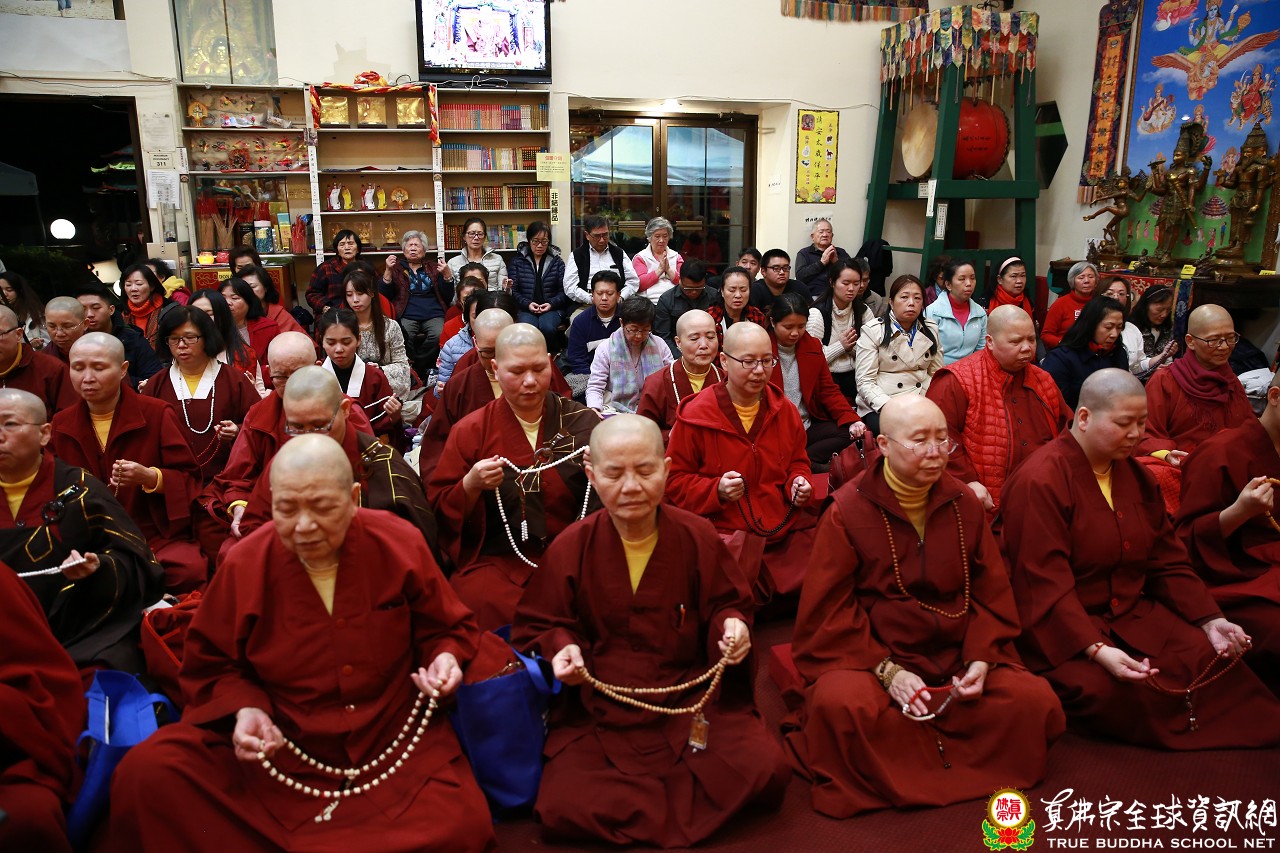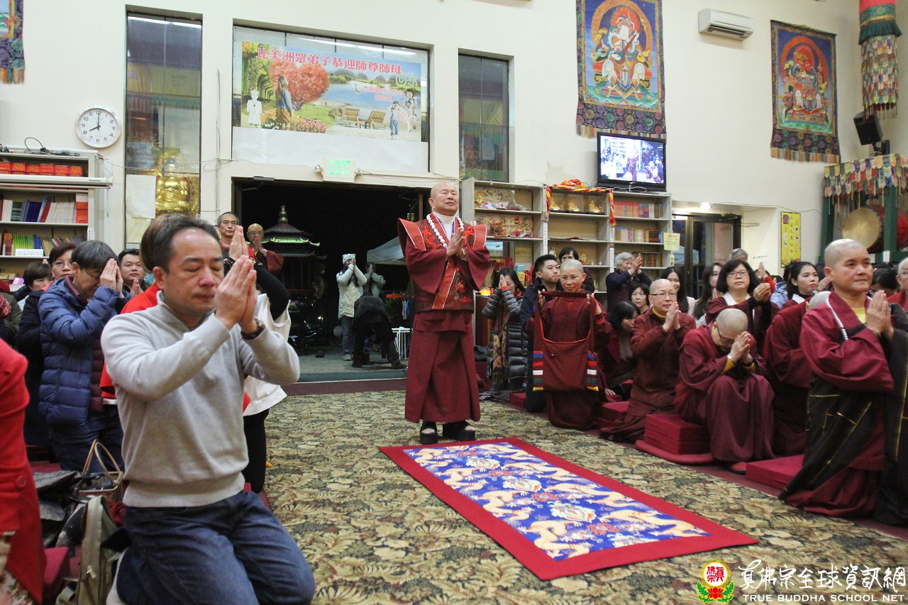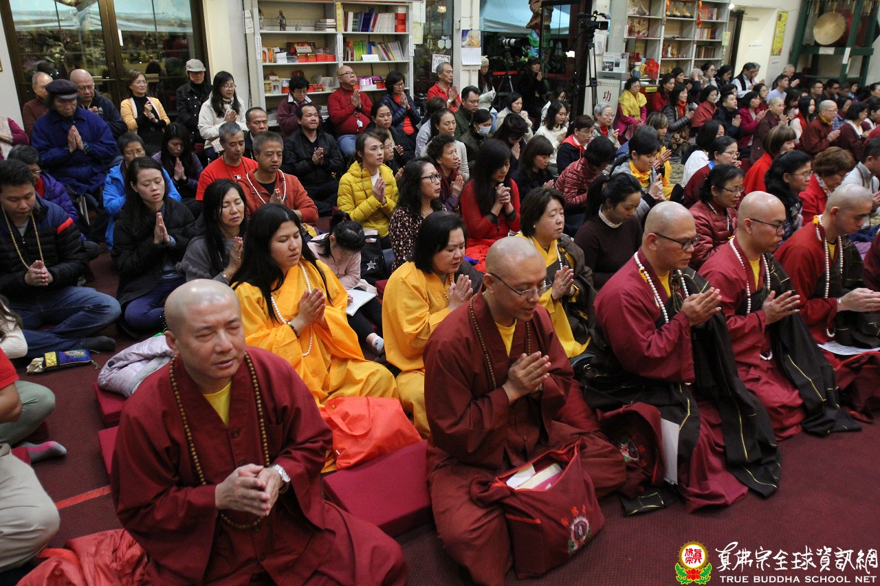 天氣雖然非常寒冷,但弟子們護持聖尊、虔心求法的熱情不減,許多同門仍從世界各地遠來祖廟朝聖。今晚西雅圖雷藏寺的同修主尊是阿彌陀佛。在同修開始前,首先舉行了西雅圖雷藏寺第三十五屆法師研習班結業儀式,本次法師研習班的學員是蓮誰法師、蓮璃法師、蓮唔法師、蓮梁法師、蓮闐法師、蓮卿法師、蓮褐法師、蓮遠法師、蓮唯法師,共九位出家法師,由聖尊頒發結業證書,並且與聖尊合影留念。在眾人的見證之下,隆重的結業儀式禮成,恭喜每一位完成法師研習班的學員,將來都能秉持聖尊的教導,自利利他、自度度他。