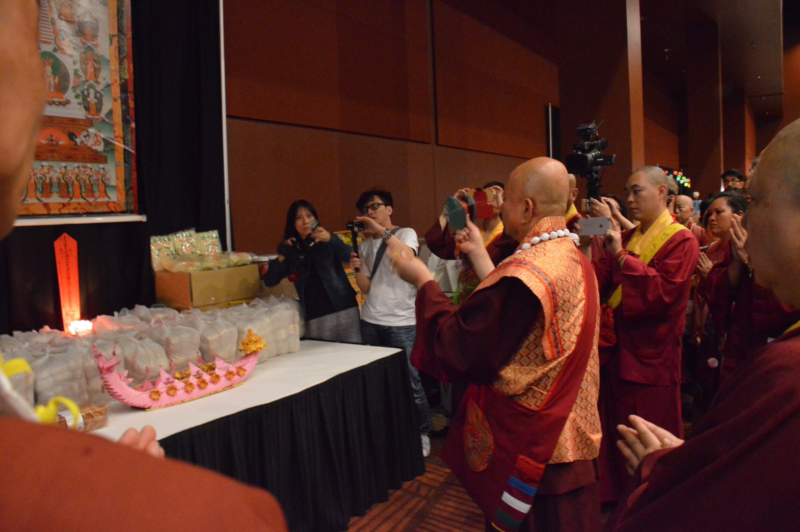 西雅圖雷藏寺2016丙申年阿彌陀佛息災超度大法會於8月27日當天隆重揭開序幕。是日,各組工作人員一大清早就到法會現場,緊鑼密鼓的準備迎接一整天的 各項活動。保安組在法會現場各處維持秩序;公關組的義工同門,一身湛藍的服飾,端莊親切的服務貴賓,穿梭於會場之中。各級弘法人員前往簽到組報到。會場周 圍環繞著琳瑯滿目的佛具攤位,十分熱鬧。