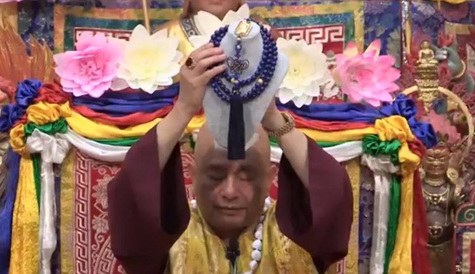 這是無上密的灌頂。灌頂的法器是「觸灌頂」,以前在古代是真正用「觸」的灌頂,但現在是不行,也有法律,但現在也是觸,只是用「毛筆」來觸的灌頂。