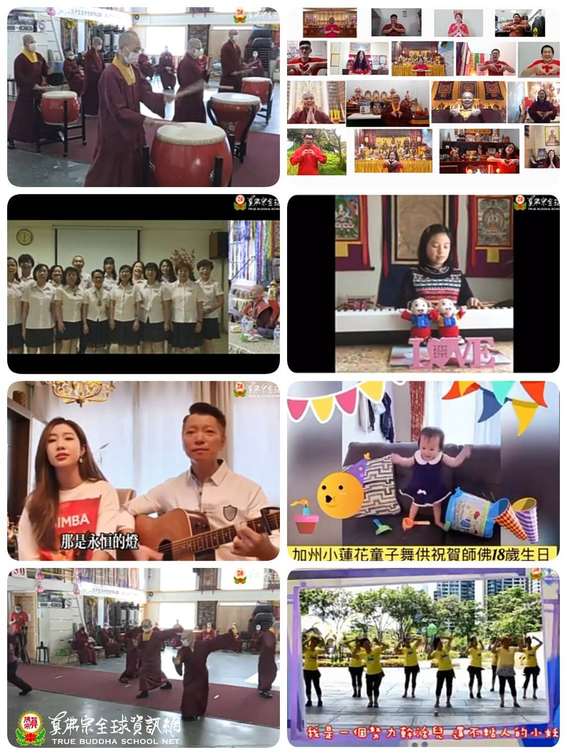 感謝有主持「娛佛節目」經驗豐富的釋蓮彥上師的協助,及負責直播、影音、ZOOM的炳祥師兄的幫忙,大家都抱著希望師尊佛誕快樂的心意,7月5日法會後,那一刻終於到來時,我們既緊張、又興奮!首先,彩虹雷藏寺弘法人員先以《鼓樂喧天來賀壽》帶出一股熱鬧氣氛,然後【雲端獻賀禮】優勝者的節目一一上演,台灣天音雅樂演唱兩首以師尊文章譜曲的新歌、馬來西亞心燈堂一群青少年各在不同地點唱《生日快樂》歌;彩虹雷藏寺的古典舞蹈表演優雅登場,接下來是新加坡美女彈吉他獨唱《快樂就是想師尊》、澳洲小女孩彈琴唱《清淨法身佛》、來自巴西真諦雷藏寺的中國好聲音演唱《燈》。