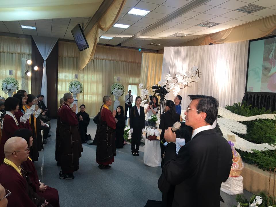 在家祭儀式的最後,堅強的金剛道伴蓮妙上師帶領家眷兒女感謝所有前來祝福拈香的貴賓們;並真情流露的敘述蓮嶝上師在往生前種種令人敬佩面對生死,仍然自在無懼的表現!