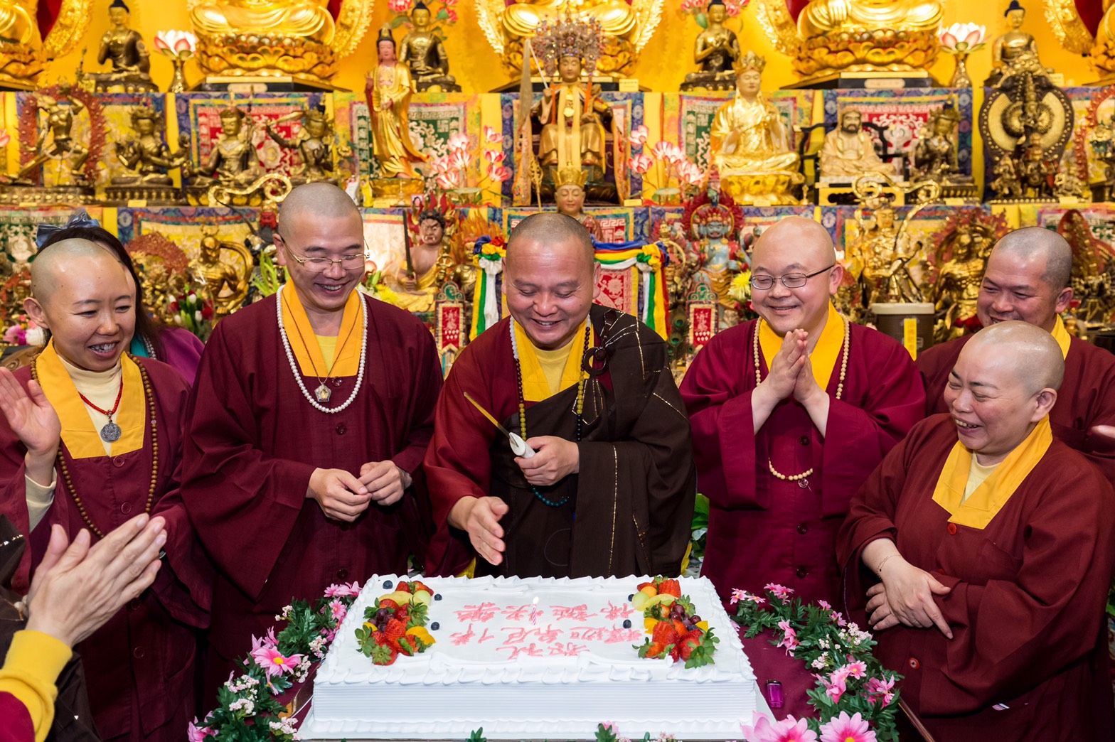 禮成後, 德輝上師首先代師賜予善信皈依灌頂後再加持大悲咒水,接著與眾上師帶領大家切蛋糕及唱生日歌祝賀釋迦牟尼佛聖誕快樂,並與大眾合影留念。大家分嚐美味的蛋糕、香湯及壽包。浴佛節同修會在愉快的氣氛中圓滿結束。