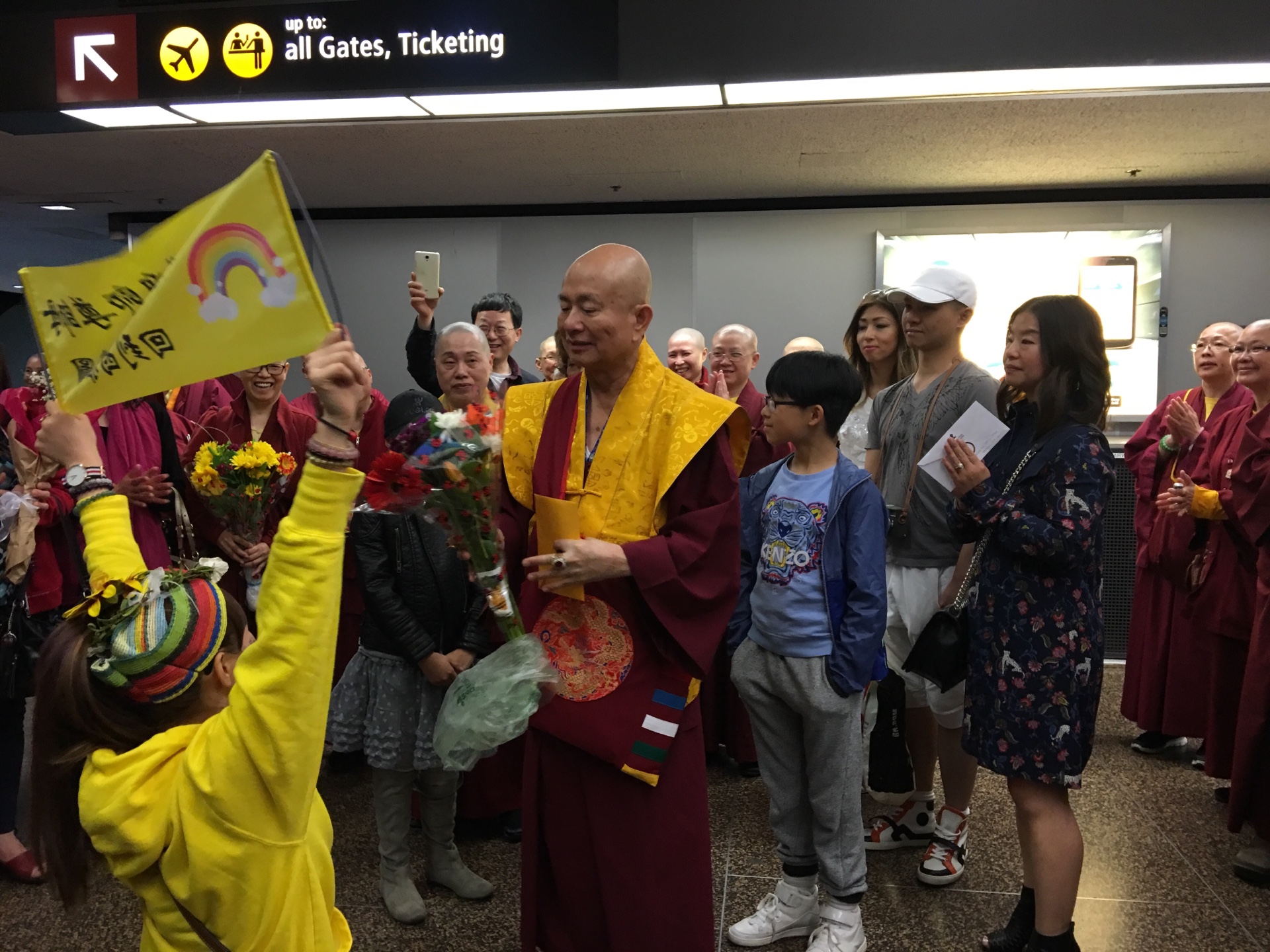 當師尊、師母的身影在手扶梯的一端出現時,所有人都高聲歡呼,並將準備好的歡迎布條拉開,現場有舞龍舞獅來迎接表達對師尊、師母無盡的想念…。在美加弟子的千呼萬喚下,師尊、師母於5月11日晚上終於平安返抵西雅圖。美加弟子雀躍等待的心,在手扶梯升起的那一霎那,見到師尊、師母緩緩出現在大家的眼前的那刻,.所有的想念氾濫成災,禁不住內心情感的湧動,全都化成一句句對師尊、師母的呼喊。