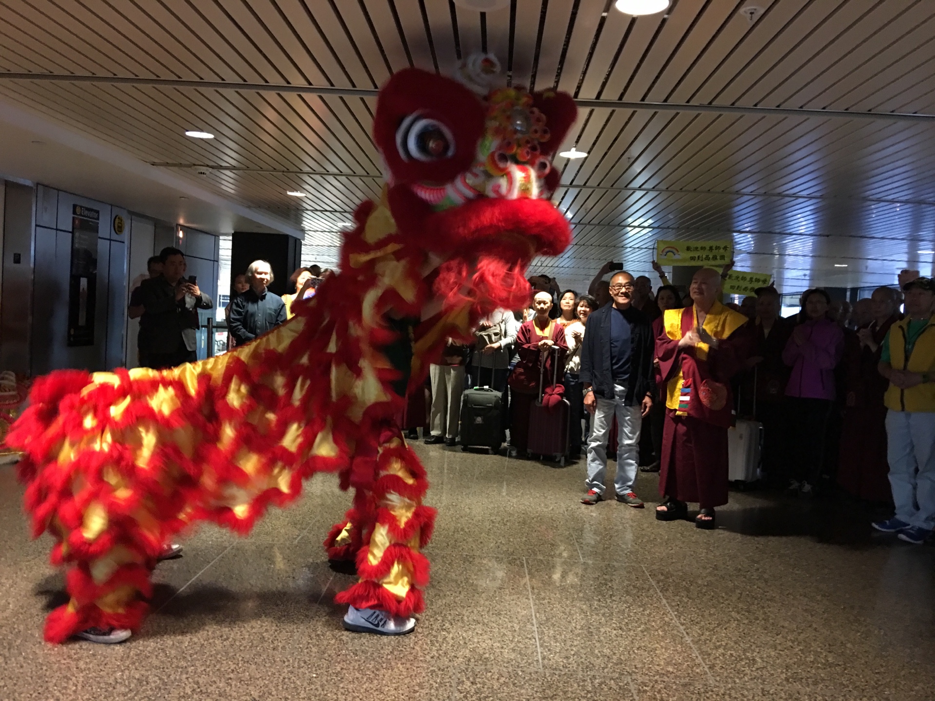 師尊、師母也親切的和大家寒暄,許多同門上前獻花,紛紛請師尊多多休息,好好休養身體。師尊、師母也開心的和大家來張幸福美滿的團體大合照。廖東周大使伉儷、周慧芳律師也來到機場迎接師尊,華埠地區麥顯輝師傅,特地準備了精彩的祥獅獻瑞歡迎師尊、師母回西雅圖。現場氣氛一團溫馨喜氣。