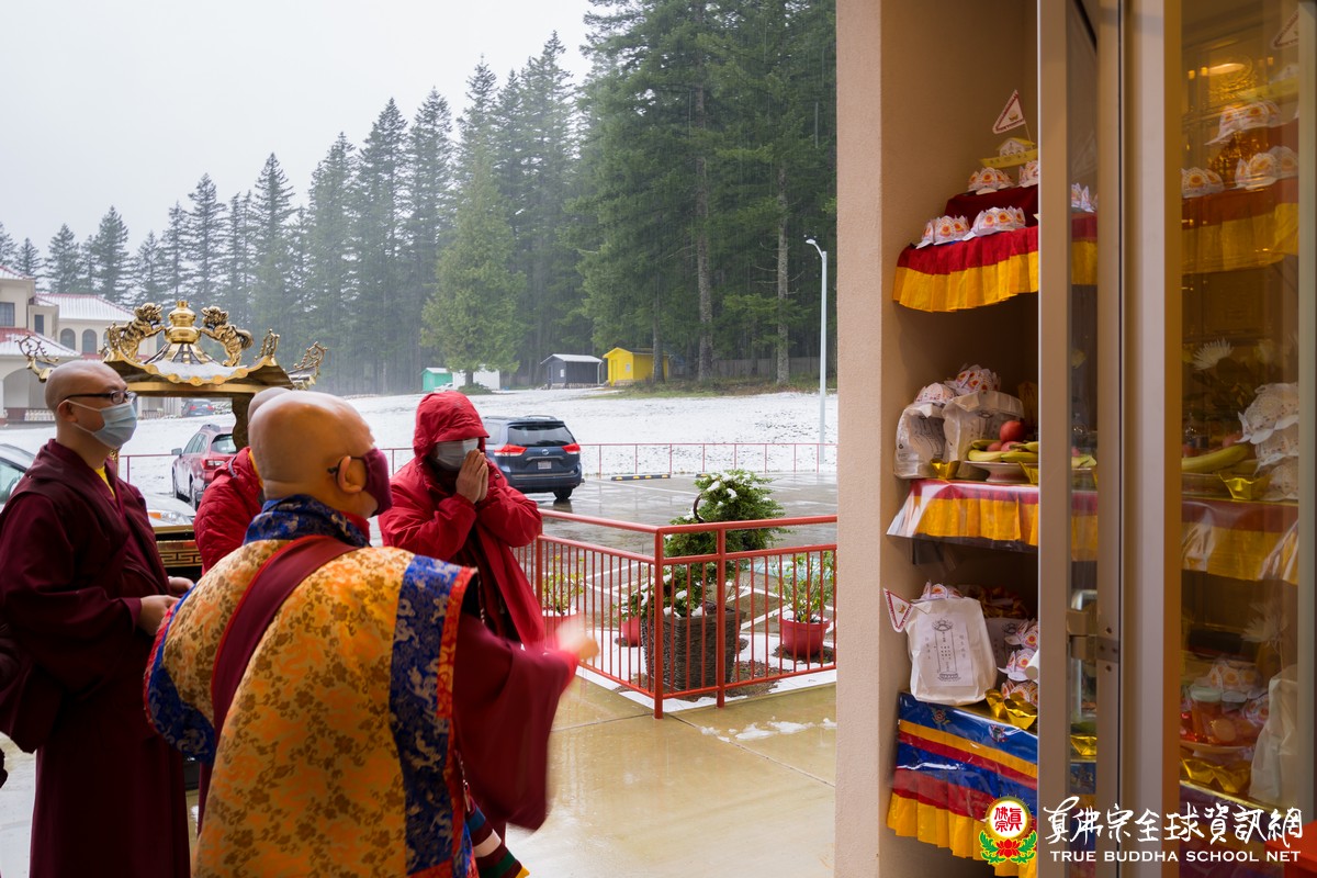 今天是彩虹雷藏寺在全新二零二一年的第一場蓮花童子護摩法會,昨夜的一場大雪,讓彩虹雷藏寺成了銀白色的世界,放眼望去一片潔皙的純白,讓人心靈有一種安寧淨化的覺受。希望二零二一年所有的人心都能得到如白雪般純淨祥和的洗禮,所有的疫情災難能得到化解。