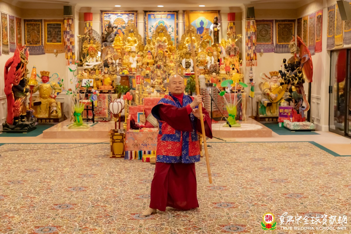 回到彩虹雷藏寺大殿,師尊最後以剛猛敏捷的金剛棍加持大家,一棍一橫掃,師尊舞出的棍花,讓大家禁不住呼喊尖叫、無限的讚嘆。晚餐時分,師尊也談到他一開始學習棍法的緣起,以及過程,師尊說到他有參考一片同門供養的棍法光碟片,之後,師尊就自己練習摸索棍法招式,以飽滿的精氣神舞出的不同凡響的金剛棍。若是在古代,師尊的習棍的天賦異稟,說是武學奇才也不為過呢!