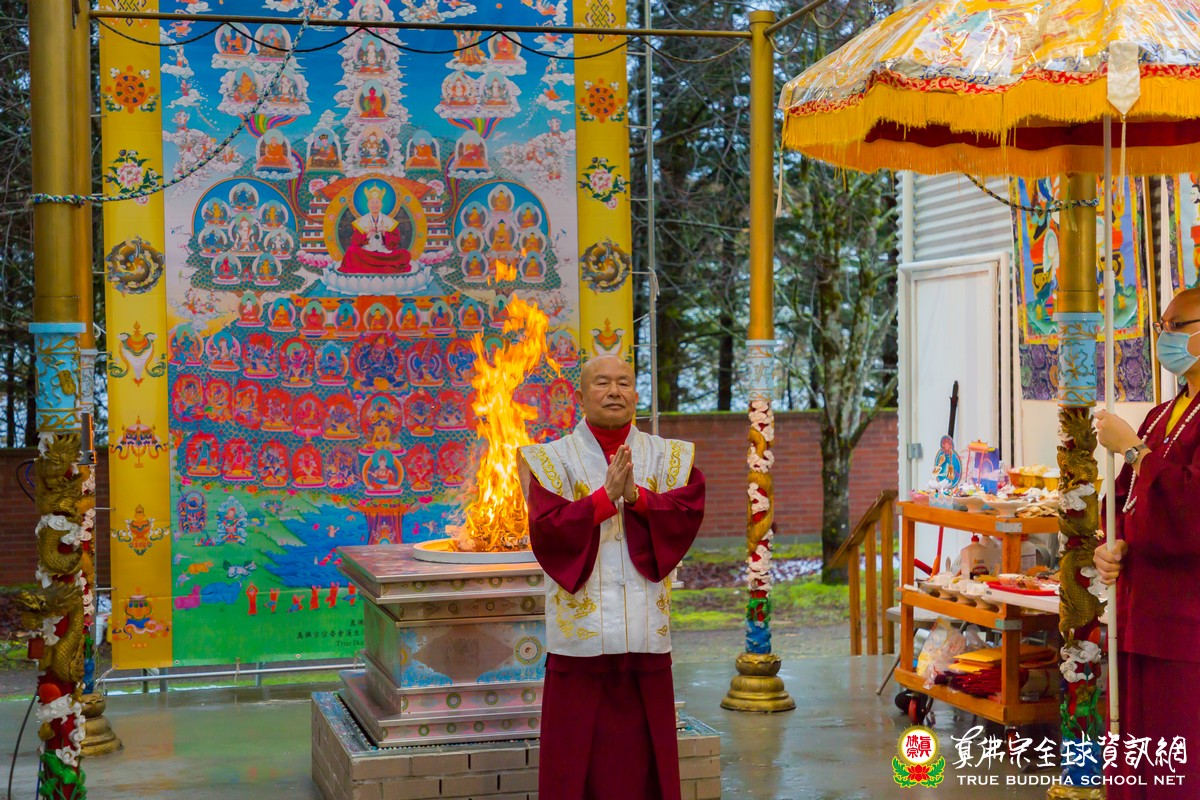 下午三點整,宏偉的蓮花童子心咒響起,師尊元旦的第一場護摩法會主尊是「蓮花童子」,雄雄的護摩火焰燃燒眾生的罪業,在師尊的威德加持力下,護佑每個報名的眾生新的一年都能有一個好的開始,一切光明吉祥。結束了師尊精彩絕倫的開示後,師尊慈悲給大眾加持灌頂。每次師尊過火後臨行前,一定會跟大家親切的打招呼,並不斷的告訴大家天氣寒冷要小心開車。這樣溫暖的叮嚀,在寒冷的冬天熨熱了每一個人的心。