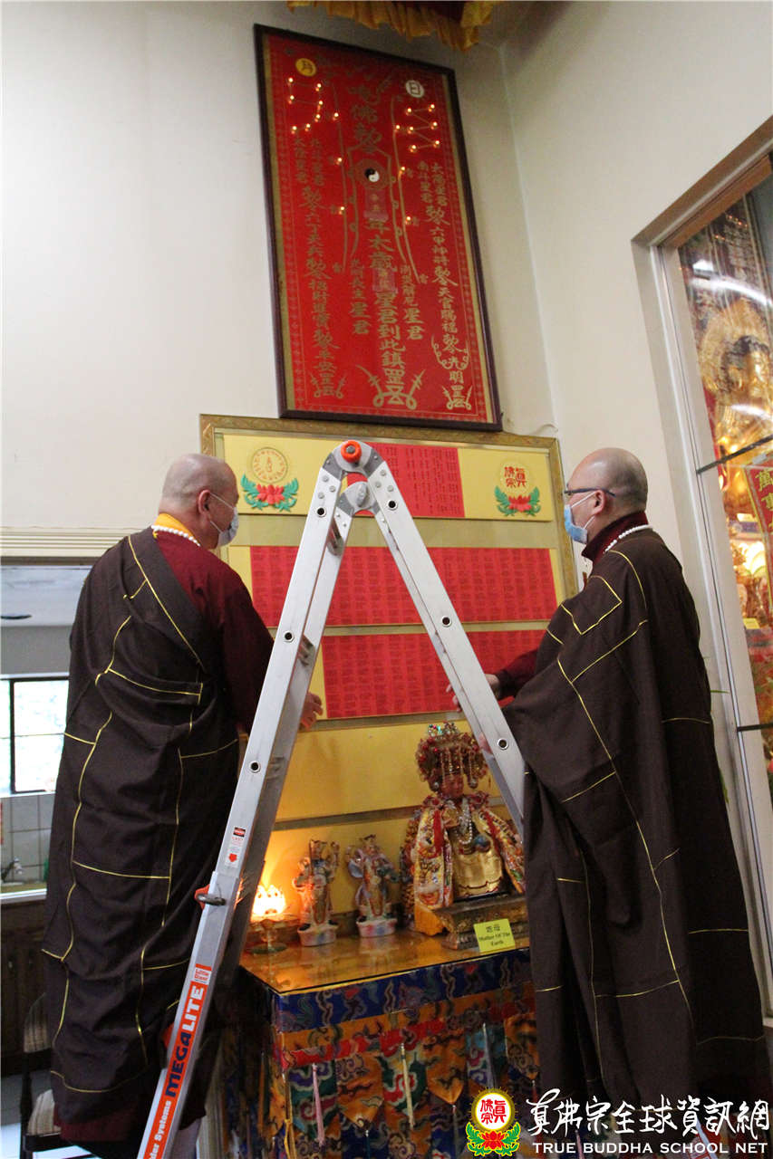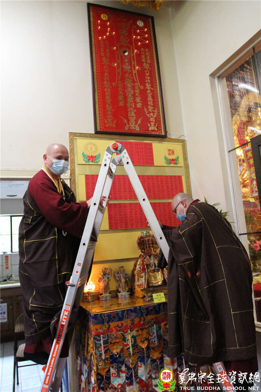 依照往年的慣例,上師、法師們在早上九點就先前往真佛密苑先做送迎太歲的儀式。緊接著,大家便前去祖廟大雄寶殿旁的地母菩薩和太歲星君壇城前,準備送迎太歲的事宜。就在那一時間,寺外天空突然大日普照,讓人心胸感到無限的開朗,覺得真是好兆頭。送迎太歲就在根本傳承上師的佛光加持下,儀軌周全圓滿,感謝庚子年盧超太歲星君過去一年的護佑,讓所有報名者能平安的度過一年,並且,祈求辛丑年湯信太歲星君,在未來新的一年加持庇佑所有報名者招財進寶聚當明,闔家平安萬事興。