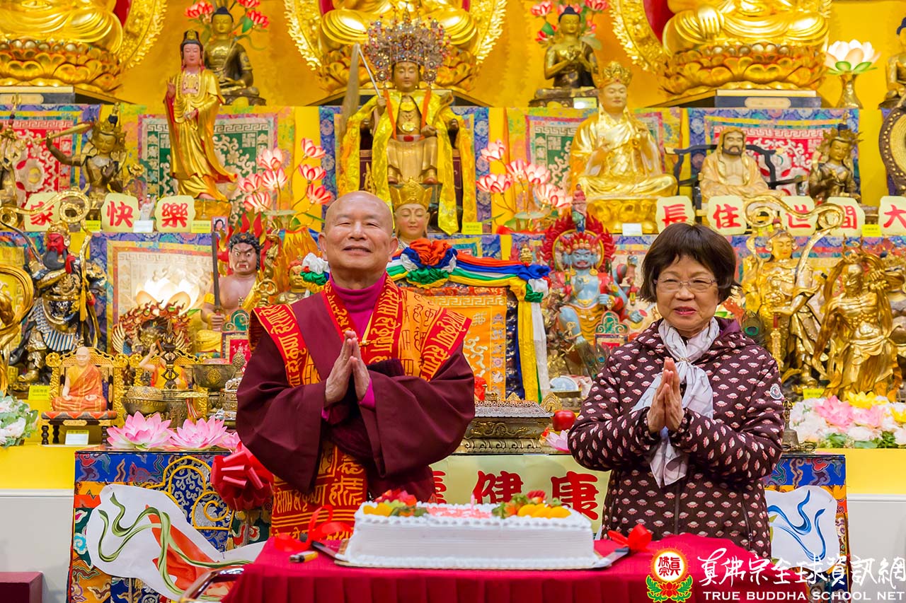 在聖尊精妙絕倫的開示後,聖尊加持大眾並加持大悲咒水和為佛像開光。祖廟特別準備了大蛋糕為慶賀聖尊的出家紀念日,大家開心的唱歌祝賀。最後,聖尊慈悲以拂塵為大家加持賜福。