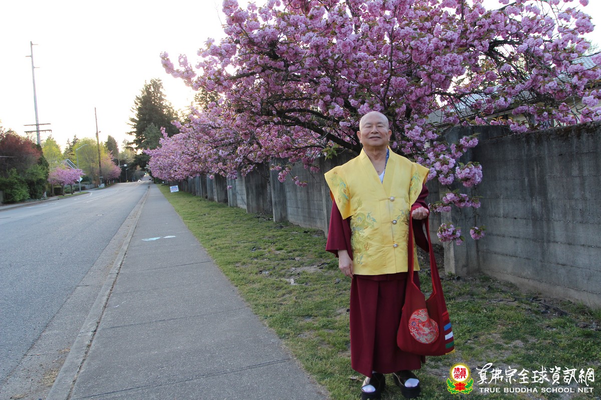 由於現在的白日漸長,雖是晚餐時分,天色仍然非常光亮,師尊與師母帶著大家到祖廟虎邊的圍牆外,只見盛開的櫻花樹一字排開,棵棵百花怒放,非常壯觀美麗!風兒吹拂,舞動著一大片有如天衣重裙般粉紅色的花海,師尊童子般的笑容在花下留影。看著師尊在花前悠然自在的身影,抬頭認真賞花的神態,這天地間的聖者,無論是對世間的一草一木和每一個眾生都認真看待的慈悲心,形成了這一刻最唯美的畫面。