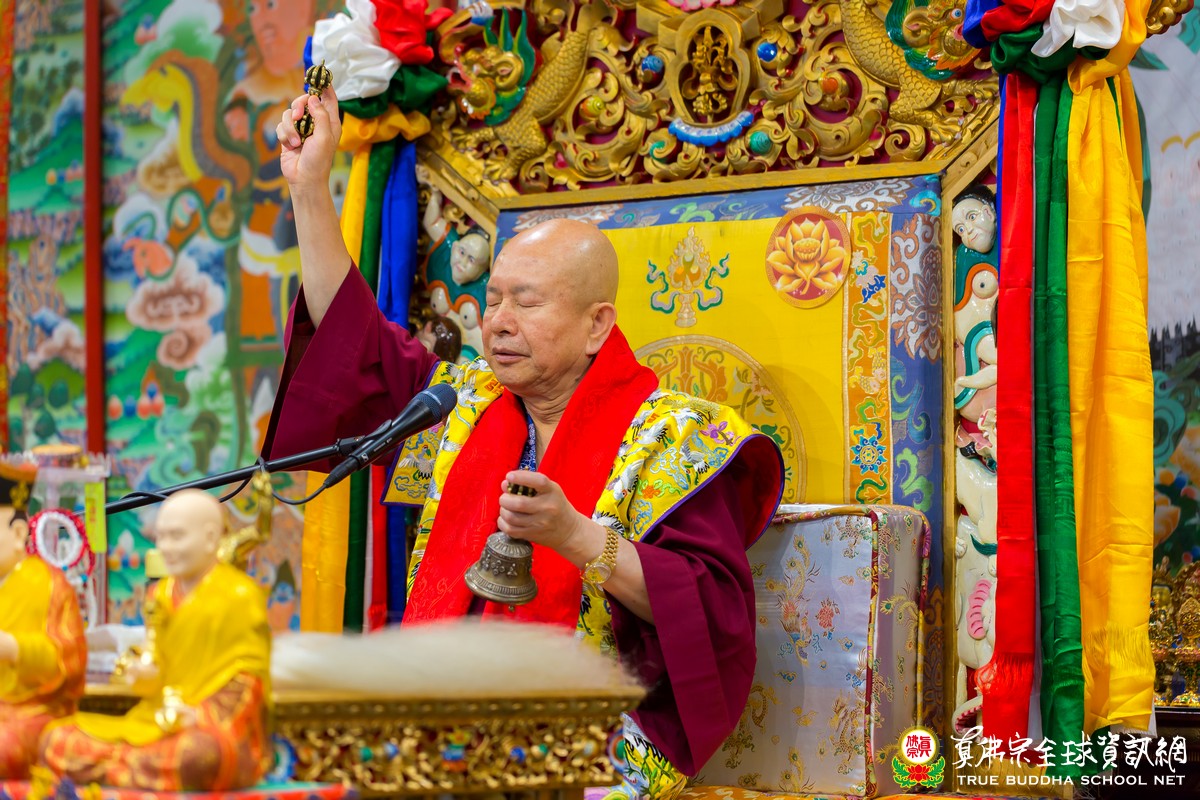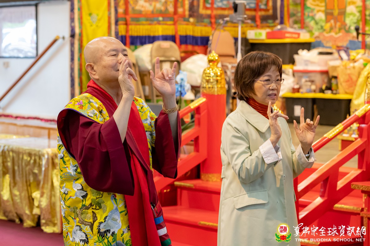 開示完畢後,現場邀請師母一同慶祝母親節。隨即,【魯冰花】及【世上只有媽媽好】的歌曲響起,師母緩緩步向蛋糕前,臉上洋溢著歡喜和悅的笑容。師母一生盡心盡力護持宗派,讓法王弘法路上無後顧之憂,幫助眾生慧命增長,實乃真佛宗之偉大母親。師母先獻花於法王,代表眾生感謝法王賜予慧命;然後法王獻花於師母,感謝師母無怨無悔為宗派全力付出。接著,師母俏皮地與法王合照,再一同與Zoom上弟子道別,法會在和樂溫馨的氛圍下,拉下帷幕。