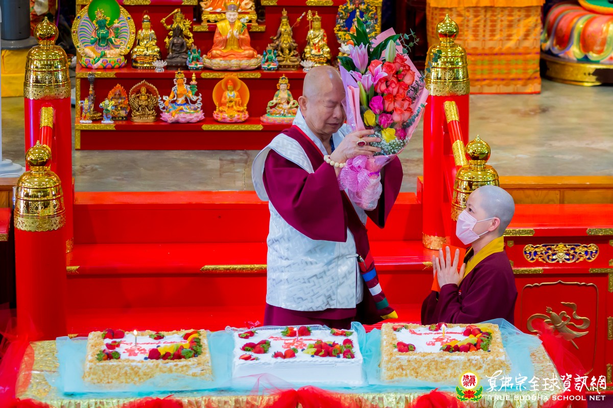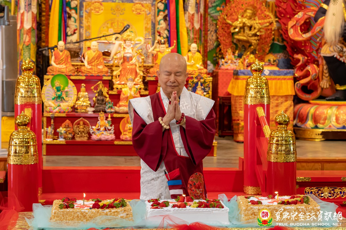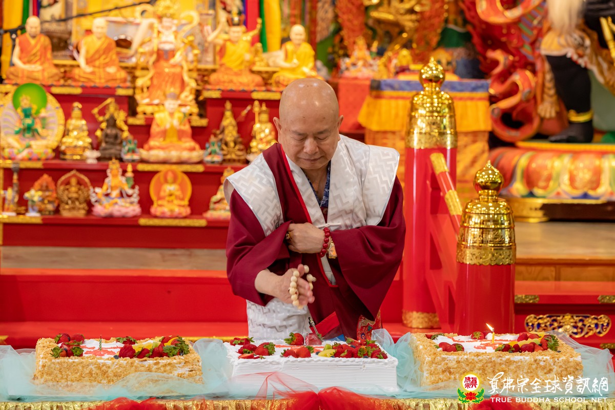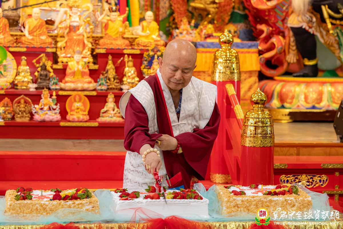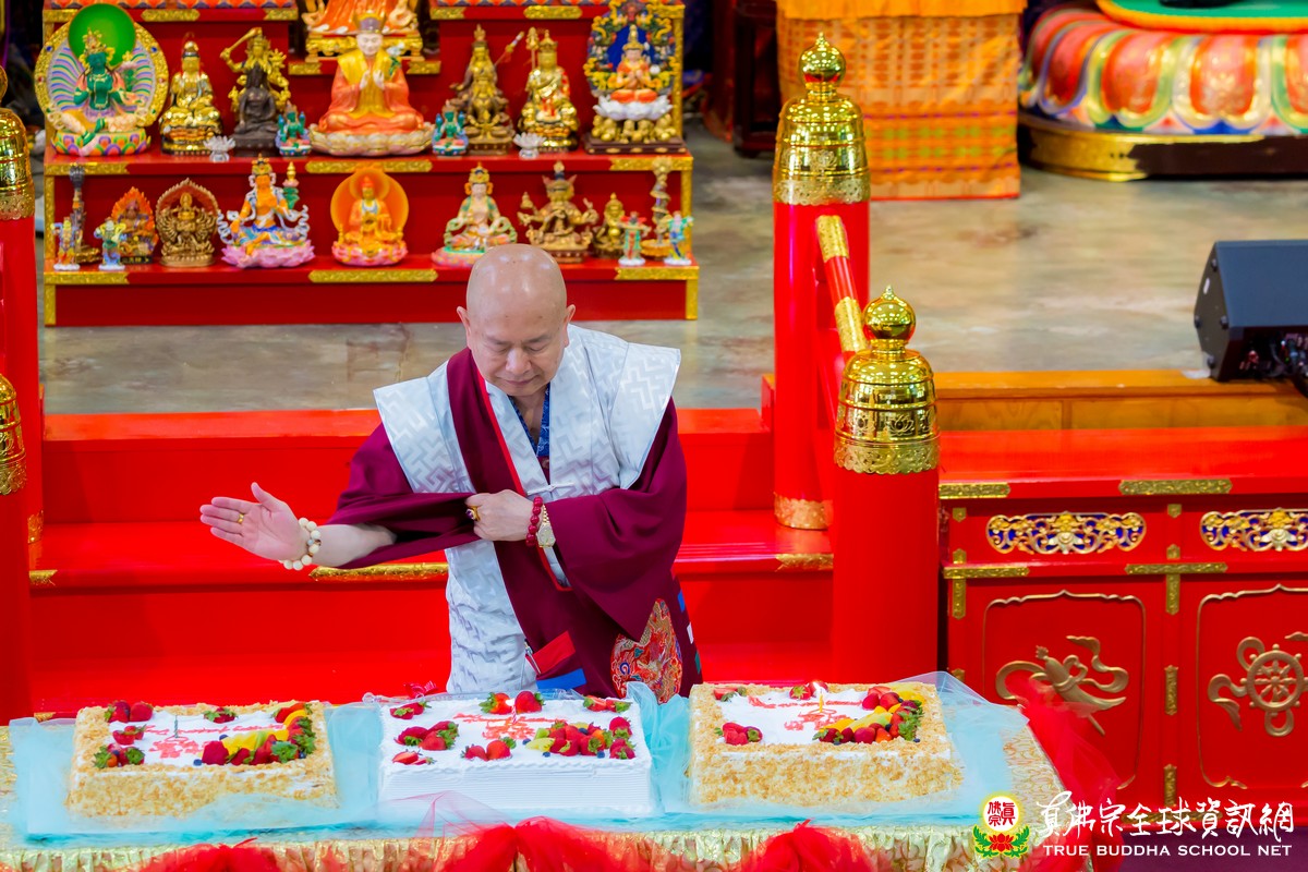 開示已畢,眾弟子齊唱「父親節快樂」歌祝賀真佛宗偉大的慈父蓮生法王父親節快樂,並請法王吹蠟燭及切蛋糕。zoom上眾弟子也紛紛祝賀法王。接著法王賜授在場弟子無上珍貴的蓮花童子法灌頂,法會吉祥圓滿。