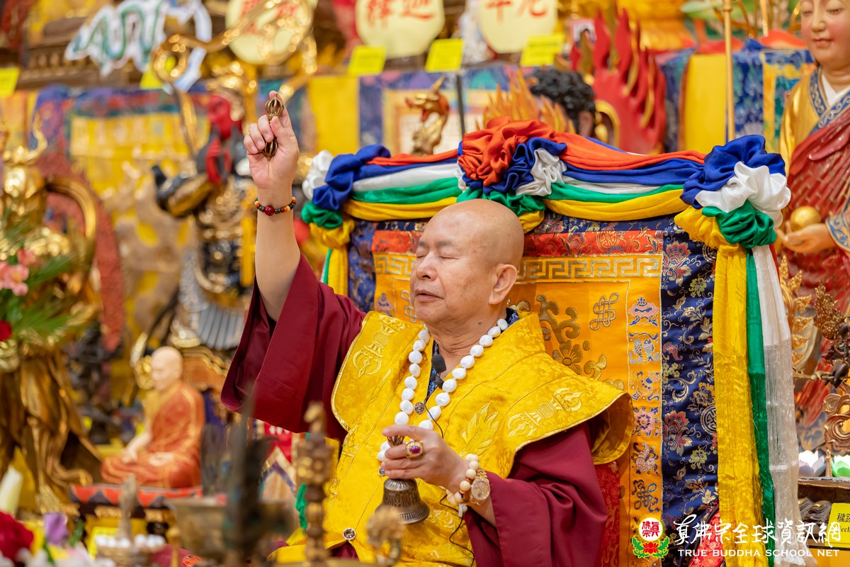 聖尊告訴大家,平時在每一天晚上加持了師母,在她的房間做了結界,一路走回房間的時候,經過供奉的諸尊,都唸祂們的名字一遍,然後,師尊敬禮所有諸尊,合掌放在頭頂上,向祂們敬禮。敬禮的時候,觀想自己的手掌變成佈滿整個虛空,唸一遍諸尊名號,然後觀想所有的手掌全部都在敬禮,一萬個敬禮、一萬萬個敬禮、一億個敬禮。這個束心、敬禮,祂們全部接受,每天晚上都這樣子做,然後刷好牙,上法座做超度,用一千隻的法船來超度所有患新冠病毒的亡者。做完超度以後,再修法入三昧地。天天晚上這樣子做,做了一年多,就算再怎麼忙,每天晚上這個功課一定要做,每一次都是到兩點甚至到四點。人一定要有那一種信念,為了一個理想,「不捨一個眾生」。