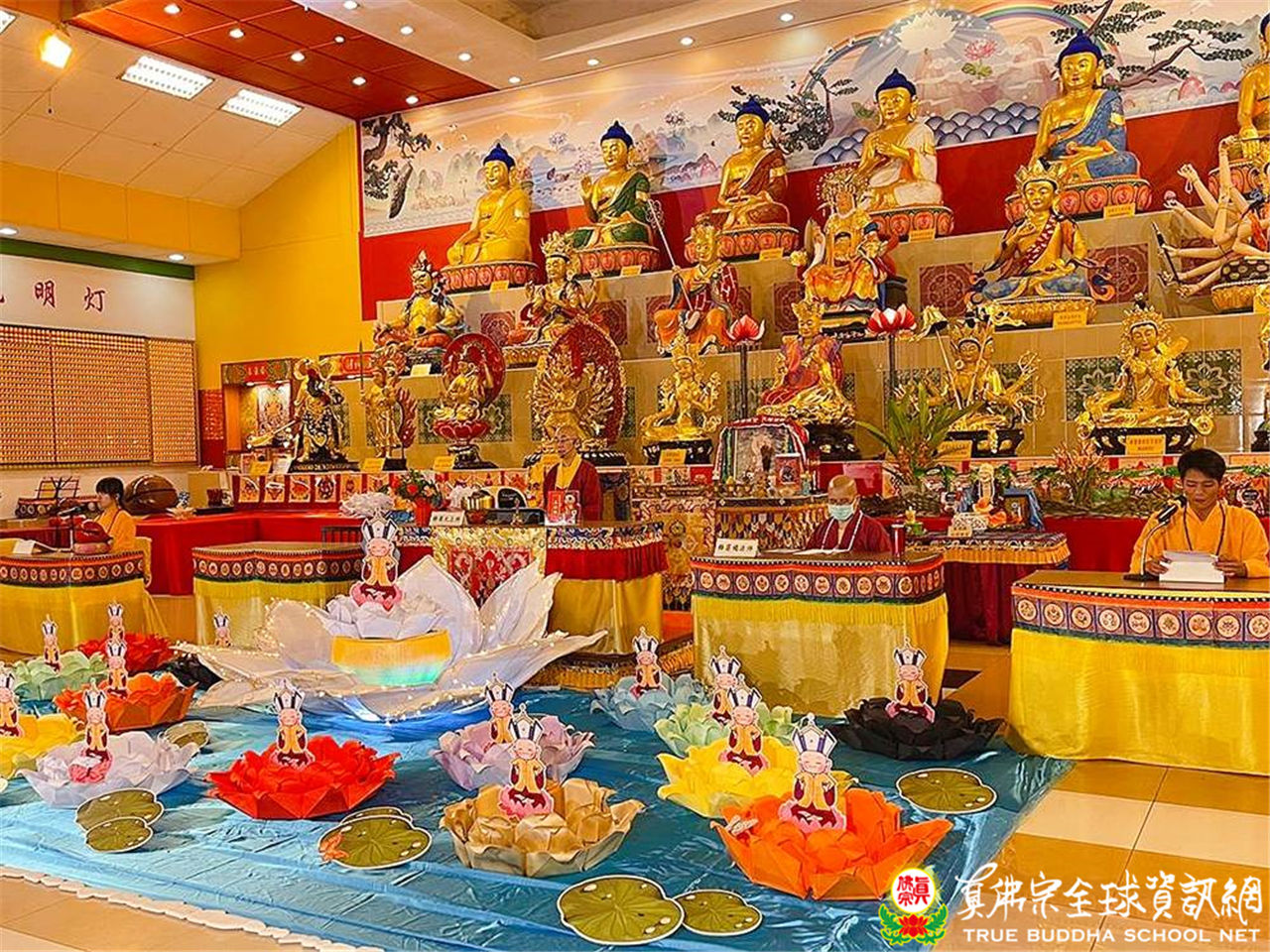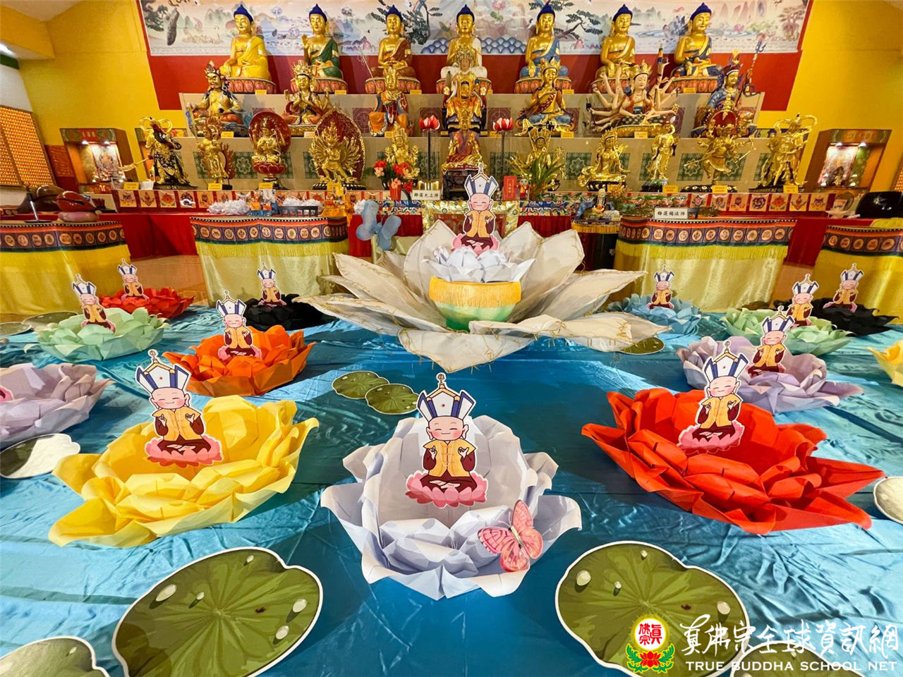 法輪雷藏寺展現了十八大蓮花童子摩訶雙蓮池,熠熠生輝、閃閃發光,令人有如進入了真佛世界,心悅意揚。
