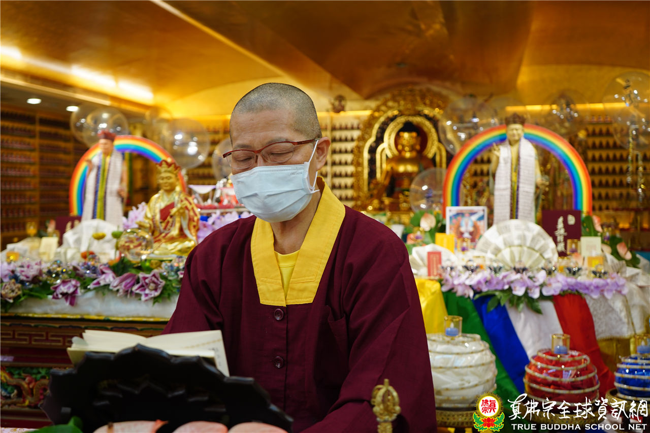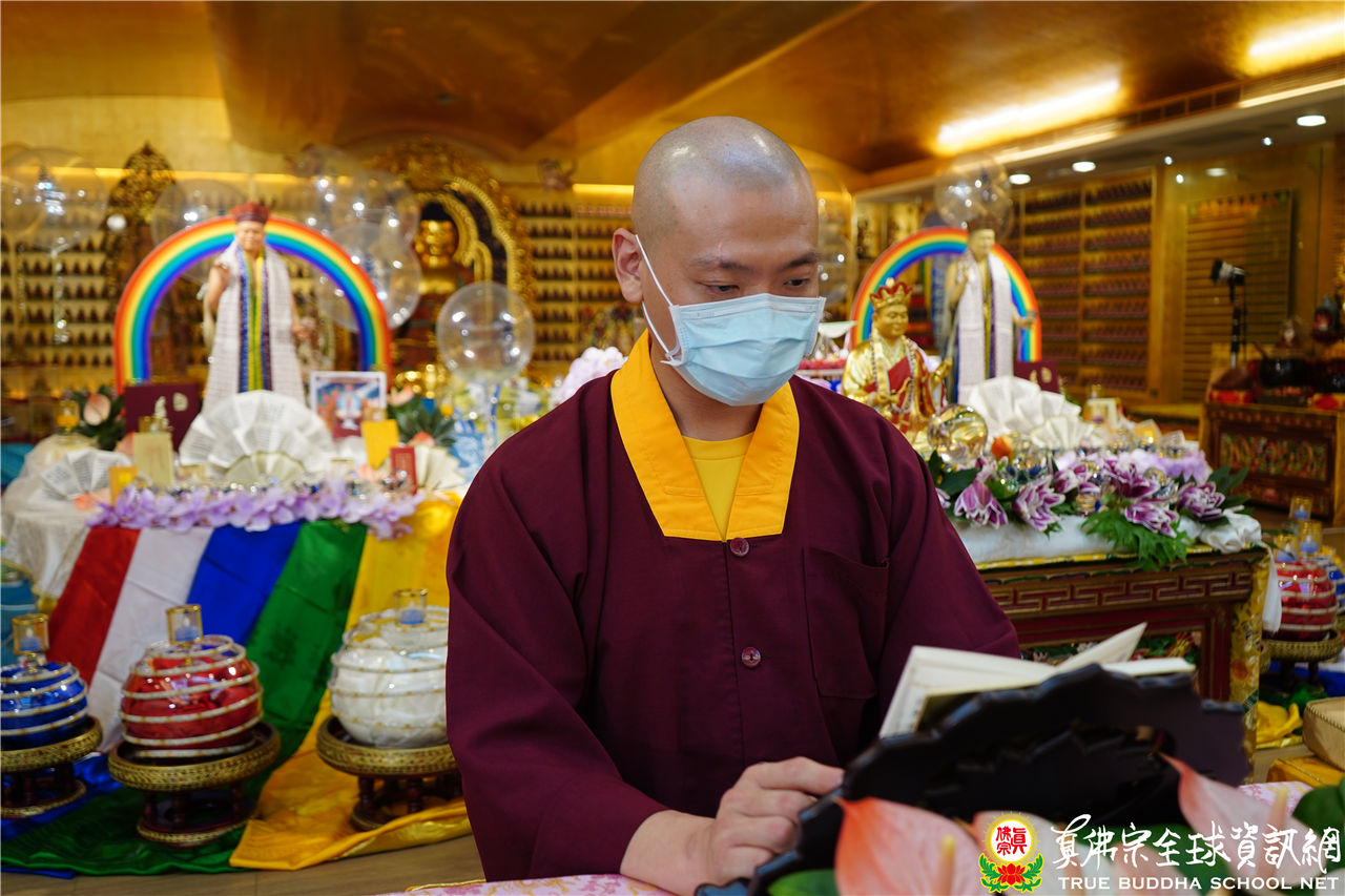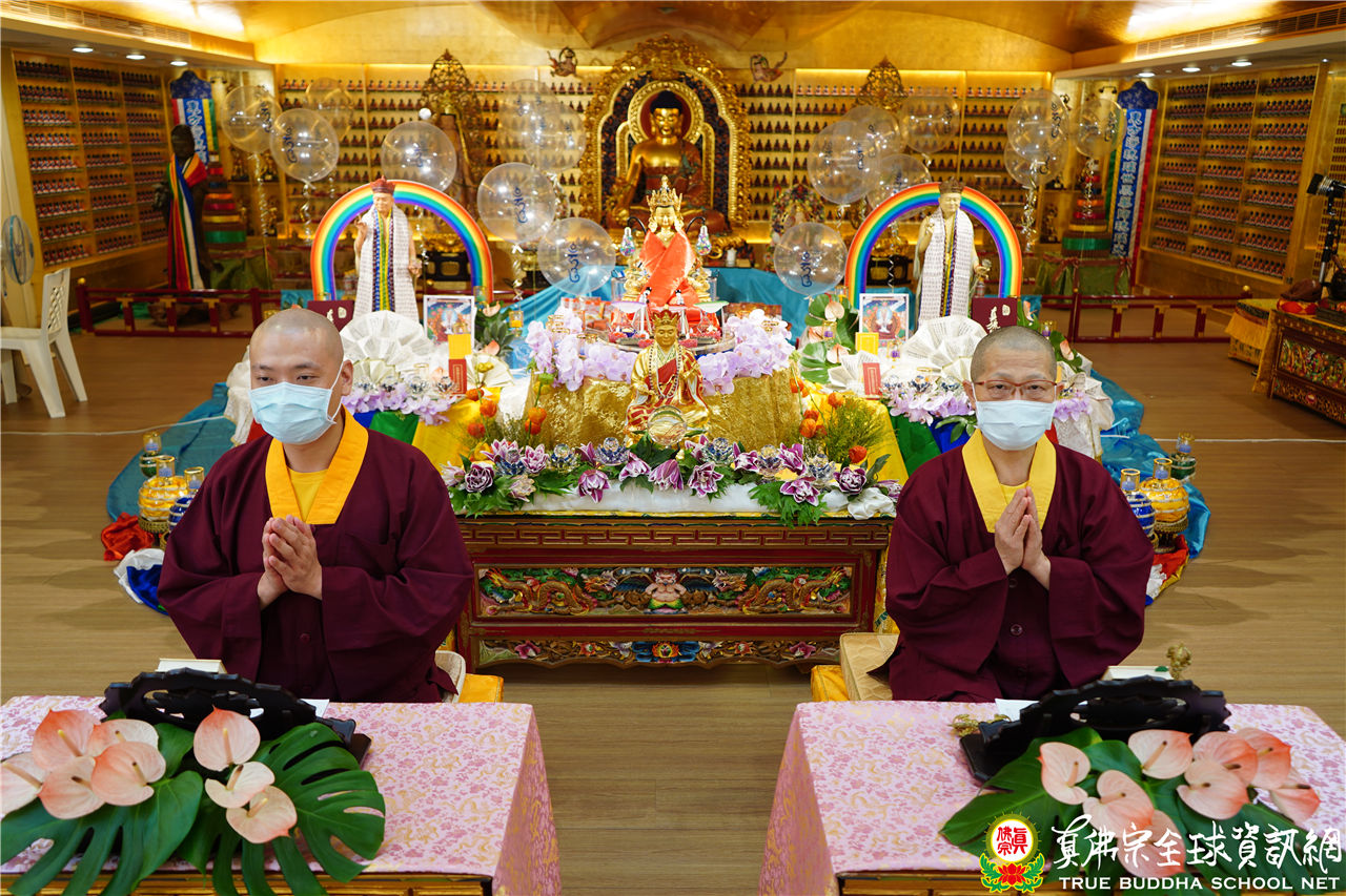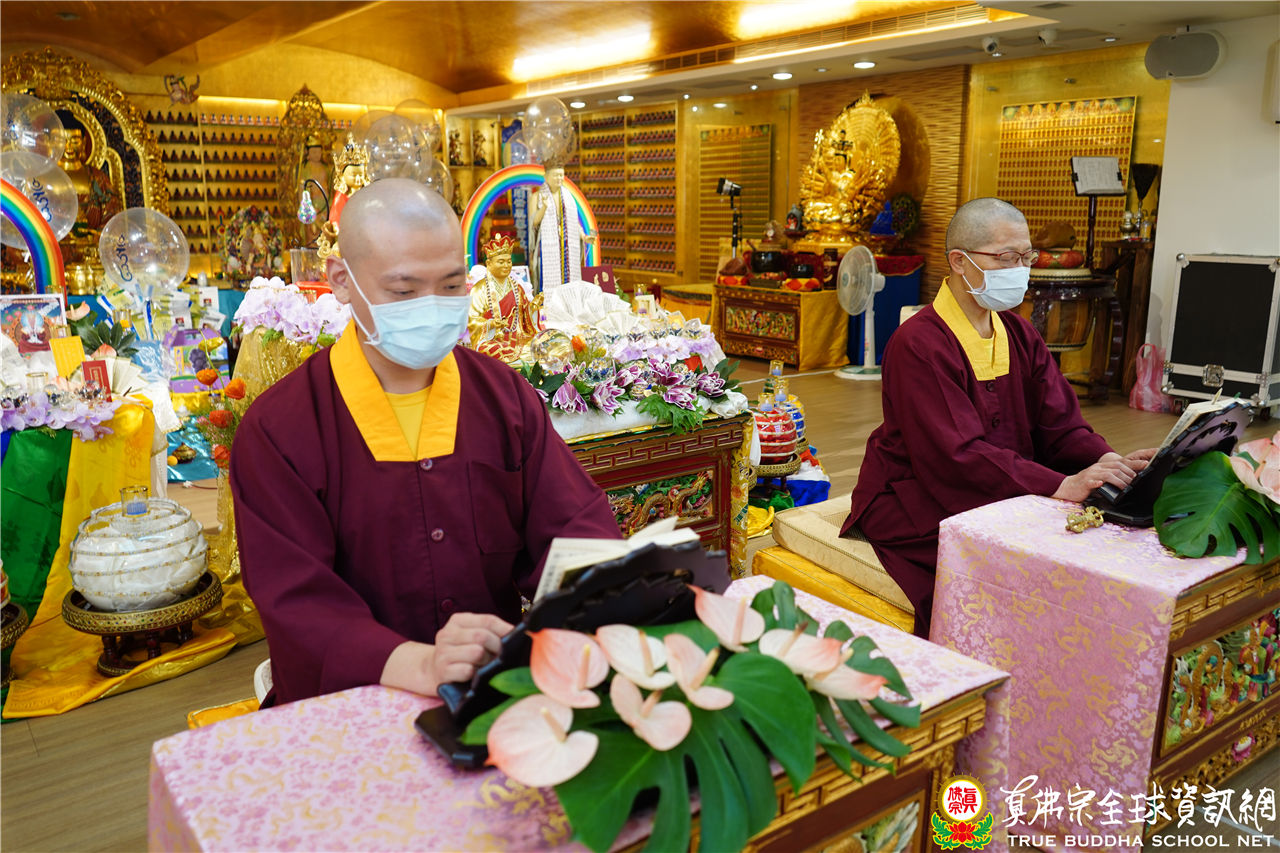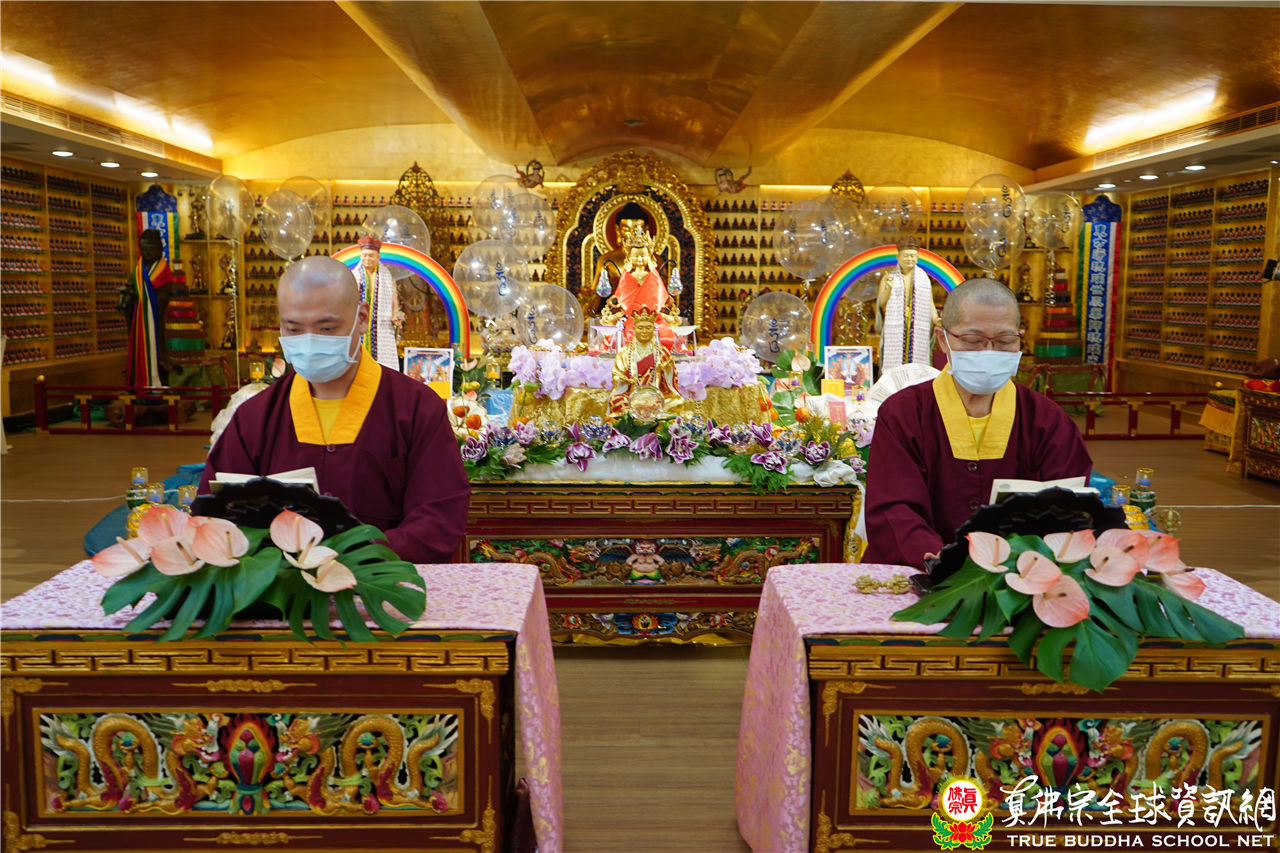文宣處處長釋蓮悅上師在中觀堂進行帶領持誦,並邀請了釋蓮舅上師助陣。中觀堂畫面中有印著「吽」字的氣球,呈現了生日會的歡樂氣氛,並有似八功德水的彩帶,裝飾著花、香、燈、茶、果,及真佛經,處處用心,既莊嚴又令人心生歡喜。