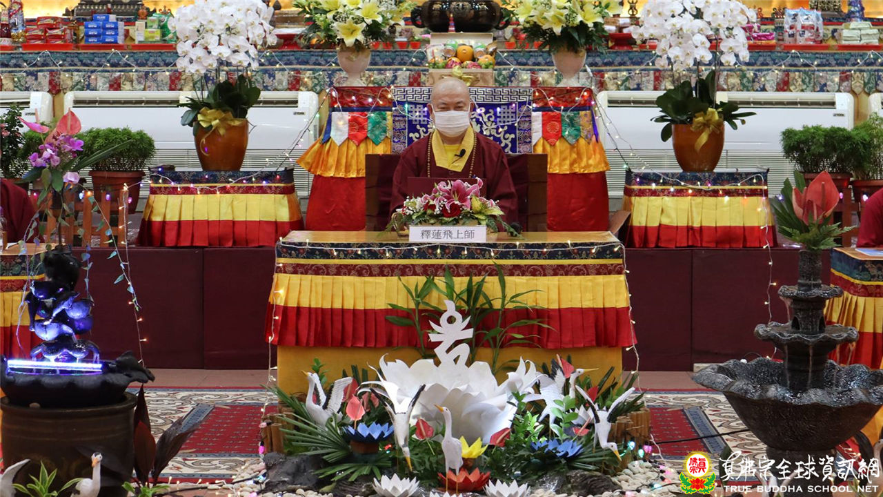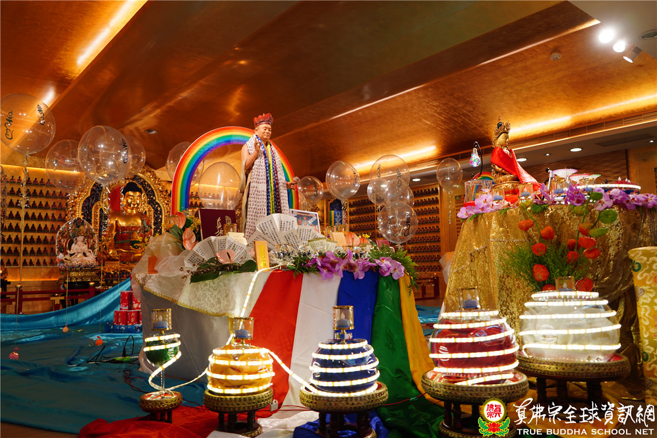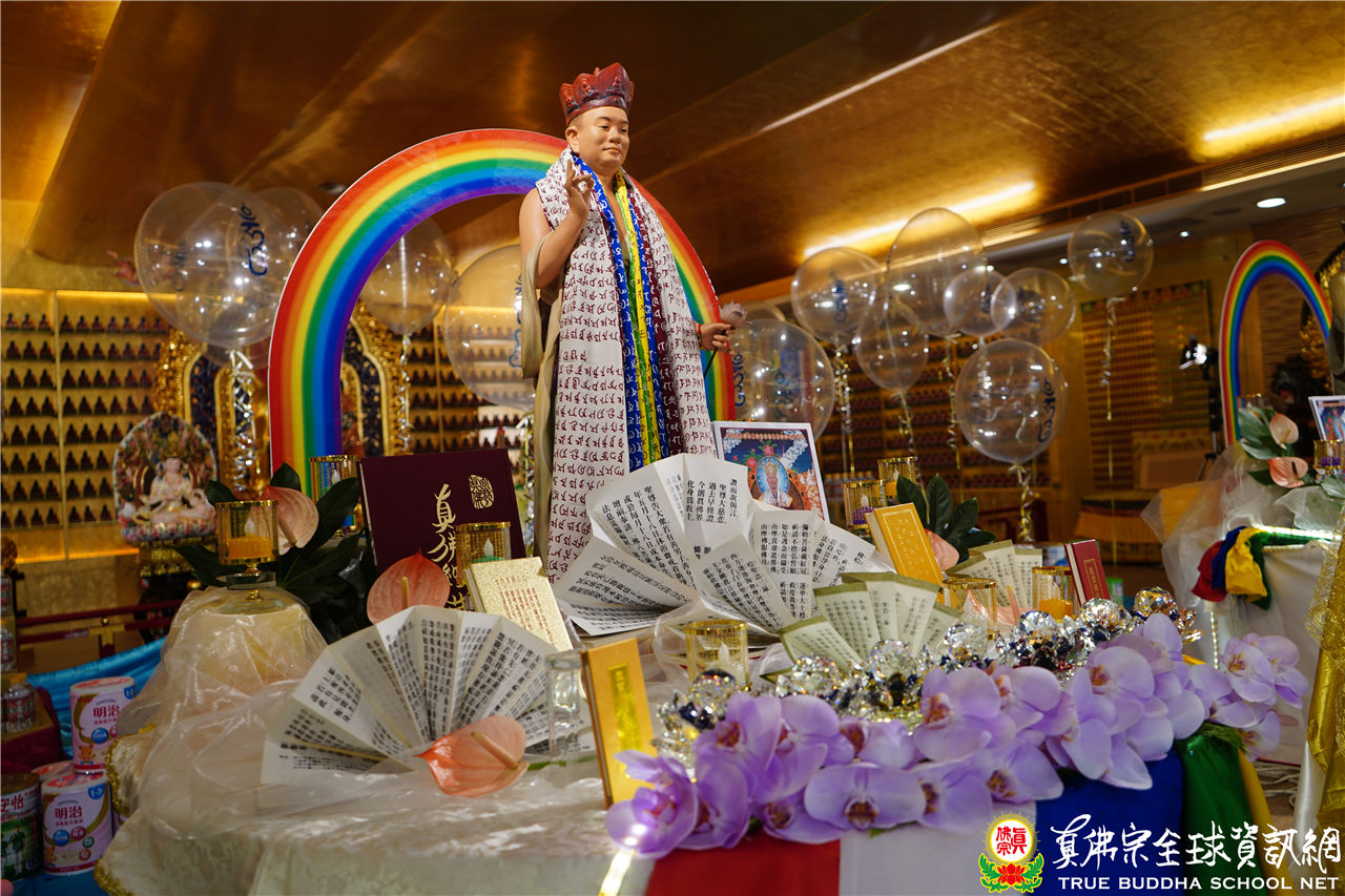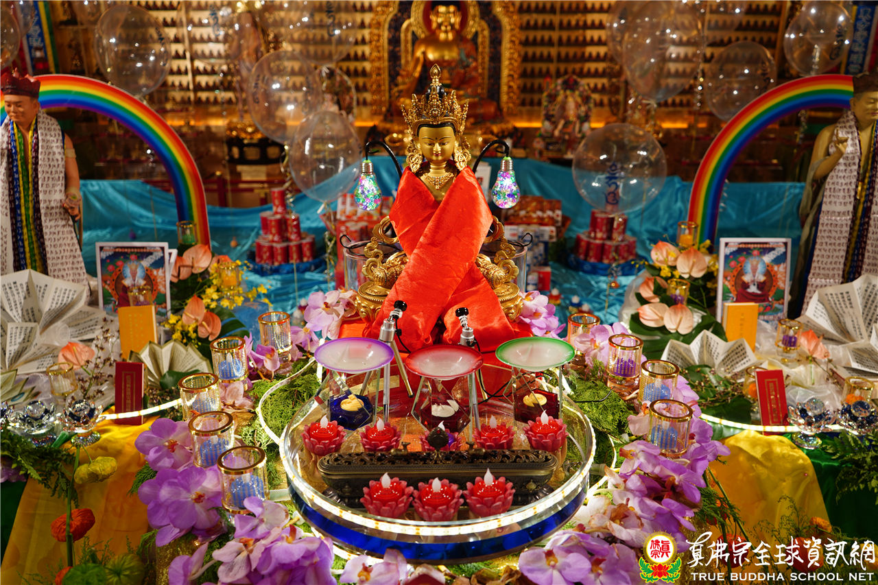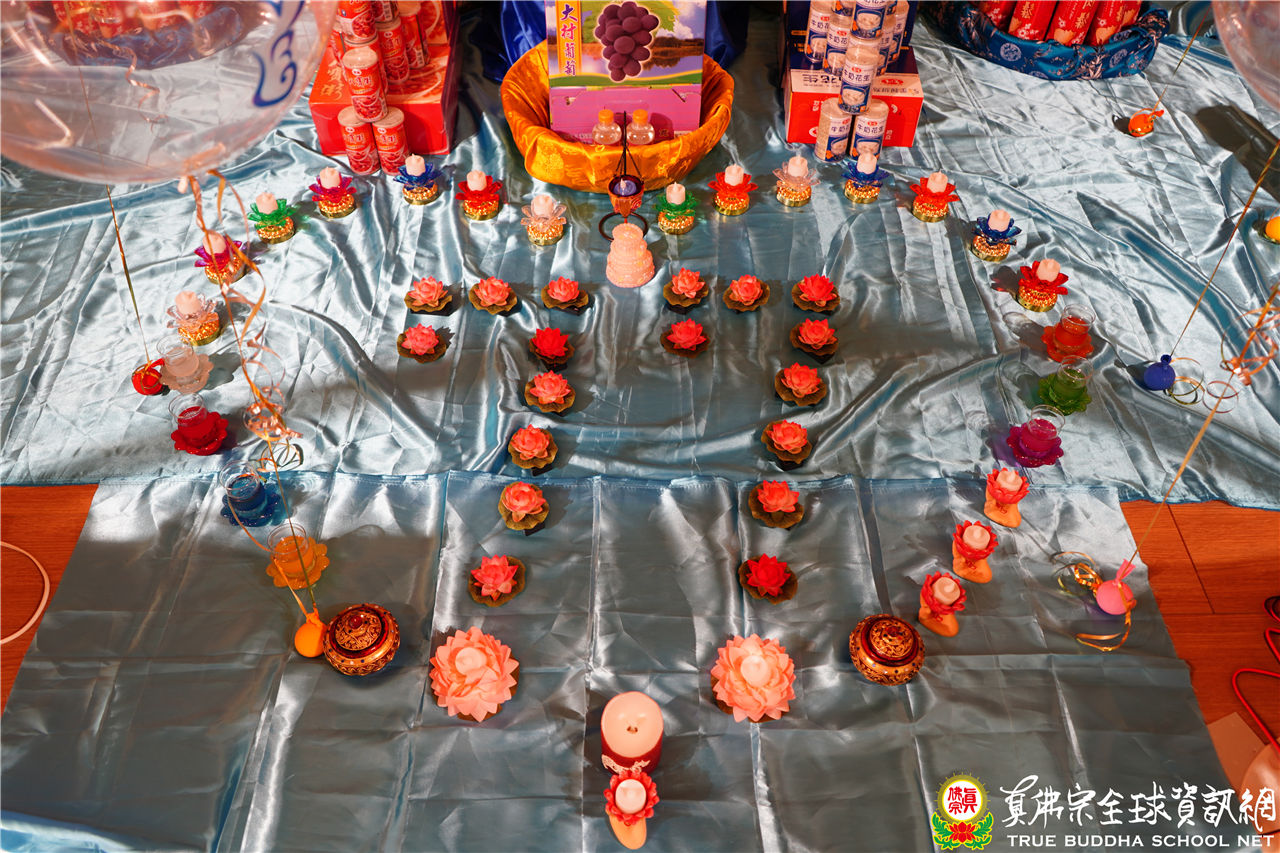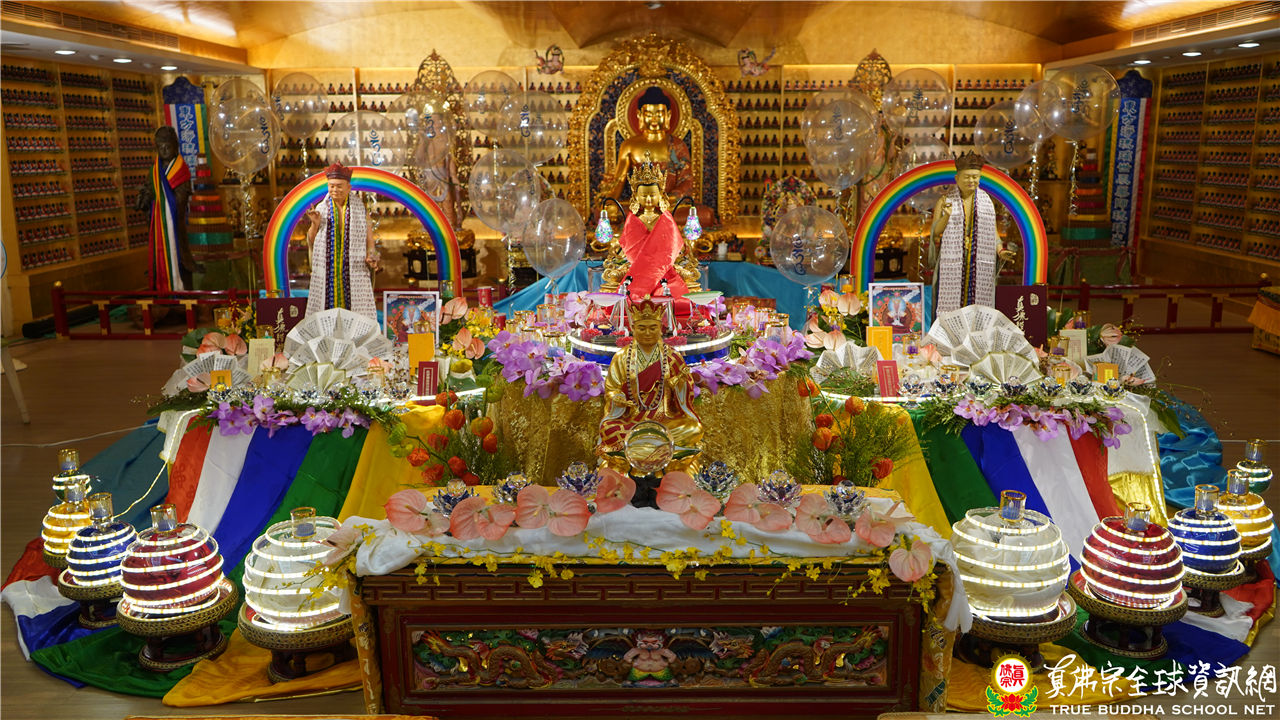 文宣處處長釋蓮悅上師在中觀堂進行帶領持誦,並邀請了釋蓮舅上師助陣。中觀堂畫面中有印著「吽」字的氣球,呈現了生日會的歡樂氣氛,並有似八功德水的彩帶,裝飾著花、香、燈、茶、果,及真佛經,處處用心,既莊嚴又令人心生歡喜。