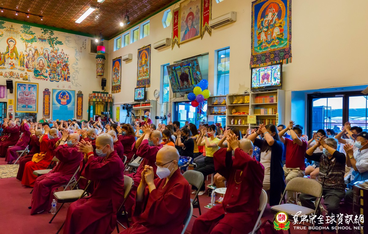 西雅圖雷藏寺在六月二十六日星期六先為師尊暖壽,大殿內佈滿了彩色氣球、壽桃、壽包、壽麵、鮮花、水果,琳琅滿目的供品堆滿了整個壇城,張燈結彩,喜氣洋洋。各地遠道來慶生的同門,都遵守防疫的規則,西雅圖雷藏寺也特別準備了愛心便當,讓大家方便用餐。在這人天同慶的大喜日子裏,老天爺也不落人後,給了我們破紀錄的炎炎夏日的高溫,好似作為大禮物送給師尊慶生,堪比同門對師尊的熱情!