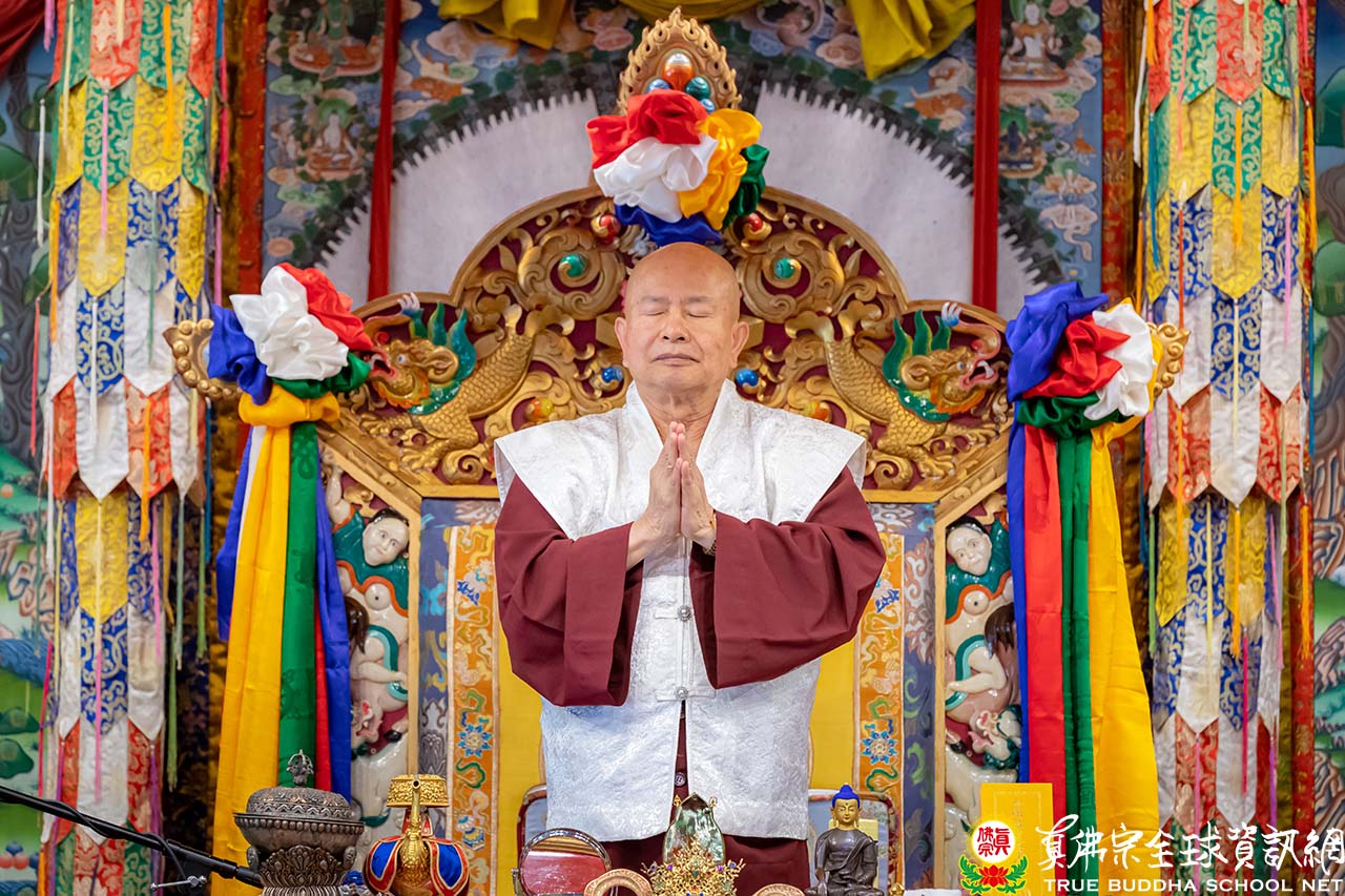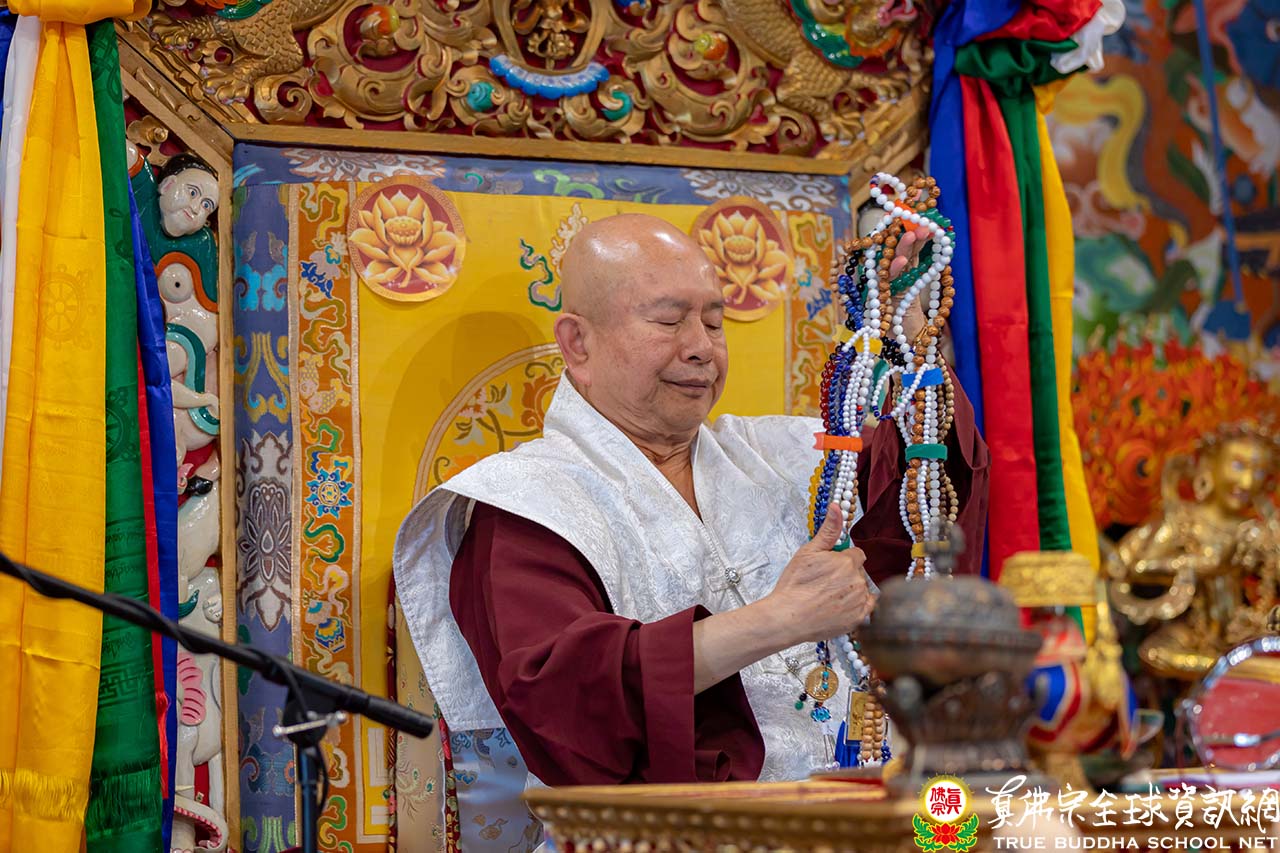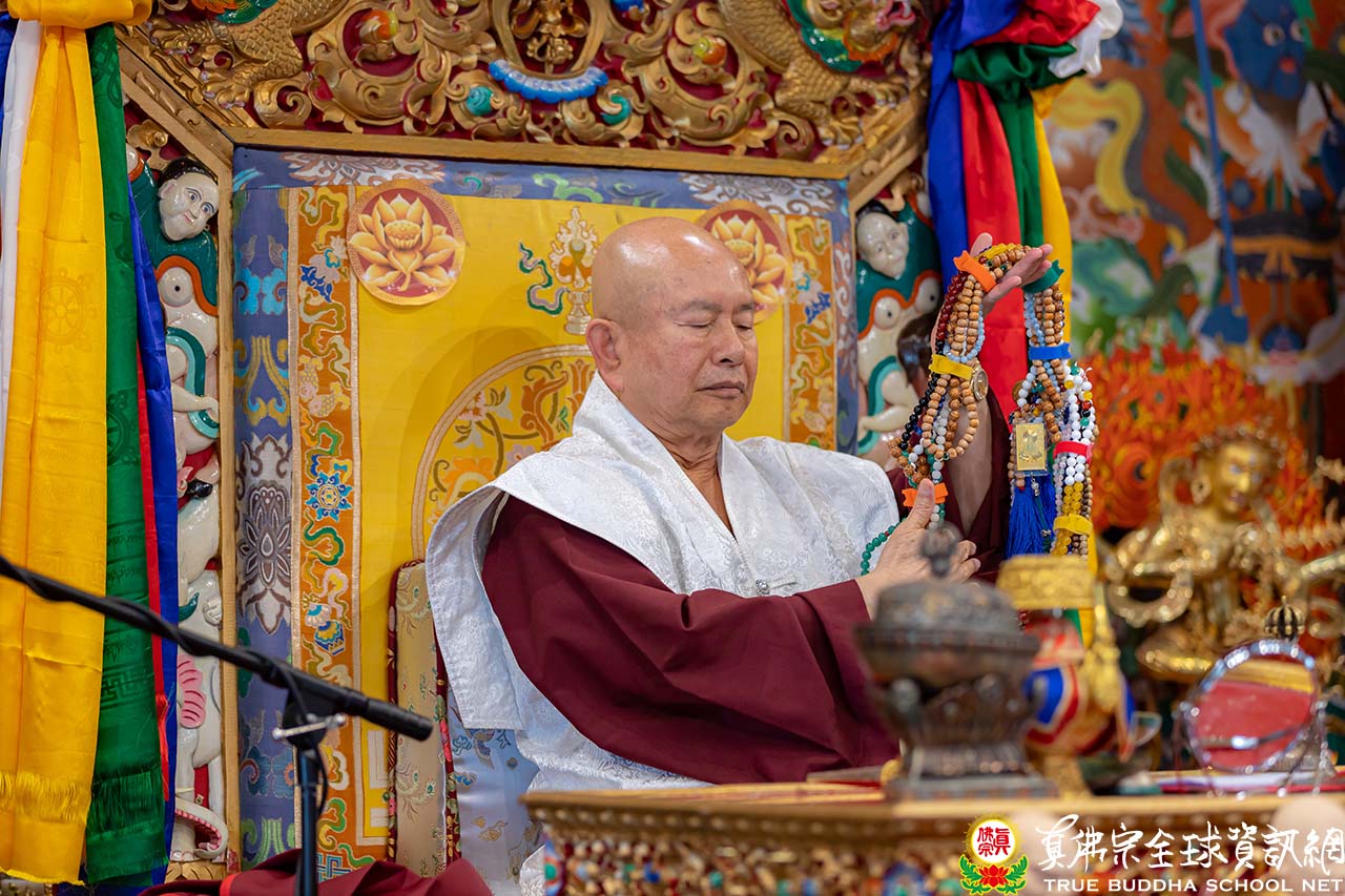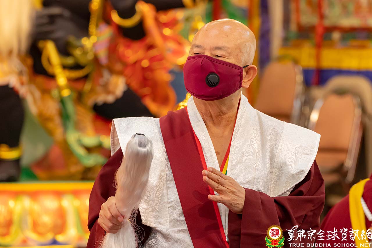 隨後,法王演示了護摩主尊的兩個手印。千手千眼觀世音菩薩也稱十一面觀音,象征著十一地。這十一面也代表著五部,最上頭頂的阿彌陀佛是佛部,當中是代表寶部、蓮華部、金剛部、羯摩部,因此被譽為五部論主。法王提及在顯教中十地以上已是佛,千手千眼觀世音菩薩已達十一地,又稱正法明如來。在這次的護摩中,法王感覺靈力非常充沛,眾人聞之更歡喜鼓掌。接著,法王開示千手千眼觀世音菩薩聚集了息增懷誅修持法,其法力具足,是非常偉大的觀世音菩薩。