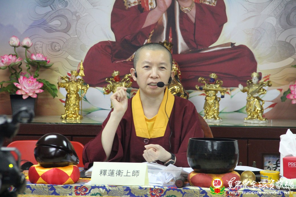 午餐時間結束。下午1時30分,上師繼續與大家分享如何帶領同修及法會儀軌的要點。上師在這個環節亦特別的播放根本上師親口念誦的咒音音檔(修法儀軌),旨在教導大家如何正確的發音與念誦[往生咒]、[觀空咒]、[八大本尊心咒]、[百字明咒]等。