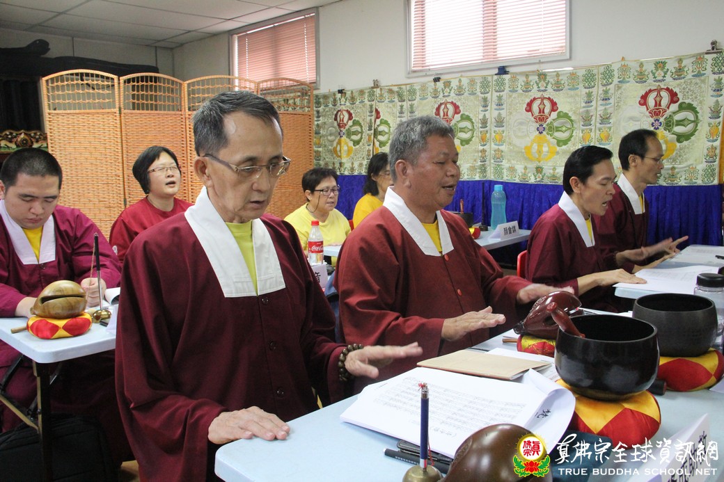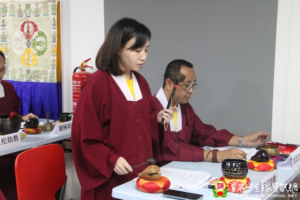 午餐時間結束。下午1時30分,上師繼續教導學員們學習唱誦與法器使用。尤其是教導大家如何正確的跟著節拍唱誦佛前大供與地藏王菩薩聖號(焰口:二音轉六音)。在上師的緊盯下,每個學員輪流唱誦起音。