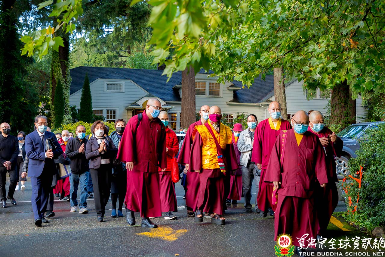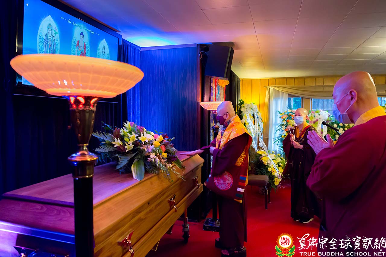 彩虹雷藏寺於Flintoft's Funeral Home and Crematory殯儀館,為釋蓮印上師舉行肅穆莊嚴的荼毗儀式。下午五點左右,許多位上師、法師及同門紛紛抵達靈堂會場,現場的氣氛平和寧靜。在儀式開始前,會場首先播放了一段蓮印上師生平的影片,有蓮印上師剃度的留影、有聖尊為他灌頂金剛阿闍梨的歷史畫面,有無數張蓮印上師在迎師時為聖尊蓮生活撐起華蓋隨侍在旁的照片。半生的過程,從少壯到老,匆匆數十寒暑,一生轉眼即過。影片裡的回憶畫面,讓現場的參加者對蓮印上師都有無限的懷念。