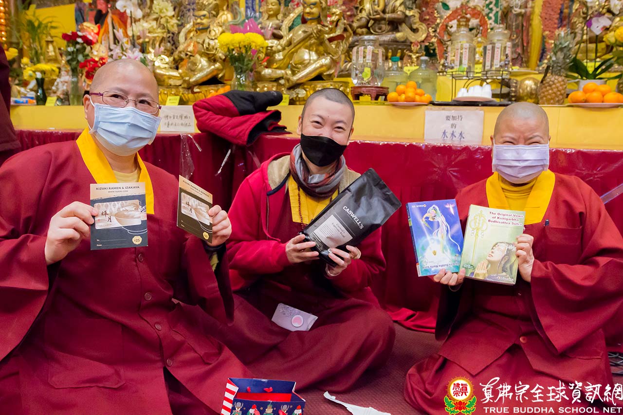 接下來的重頭戲是交換禮物,大家轉移陣地到大殿,大殿內的聖誕樹下已擺滿了聖誕禮物,經由工作人員把包裝精美的禮物編號,以便大家領取。每一個人都希望能抽到(1)號是師佛贈送的禮物,或(2)號是師母捐贈的禮物。
