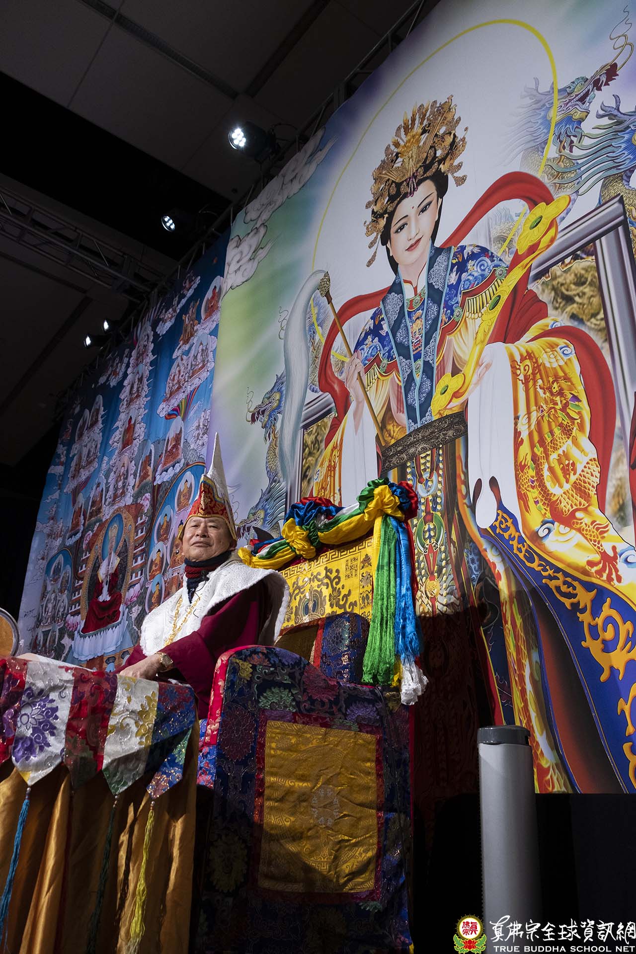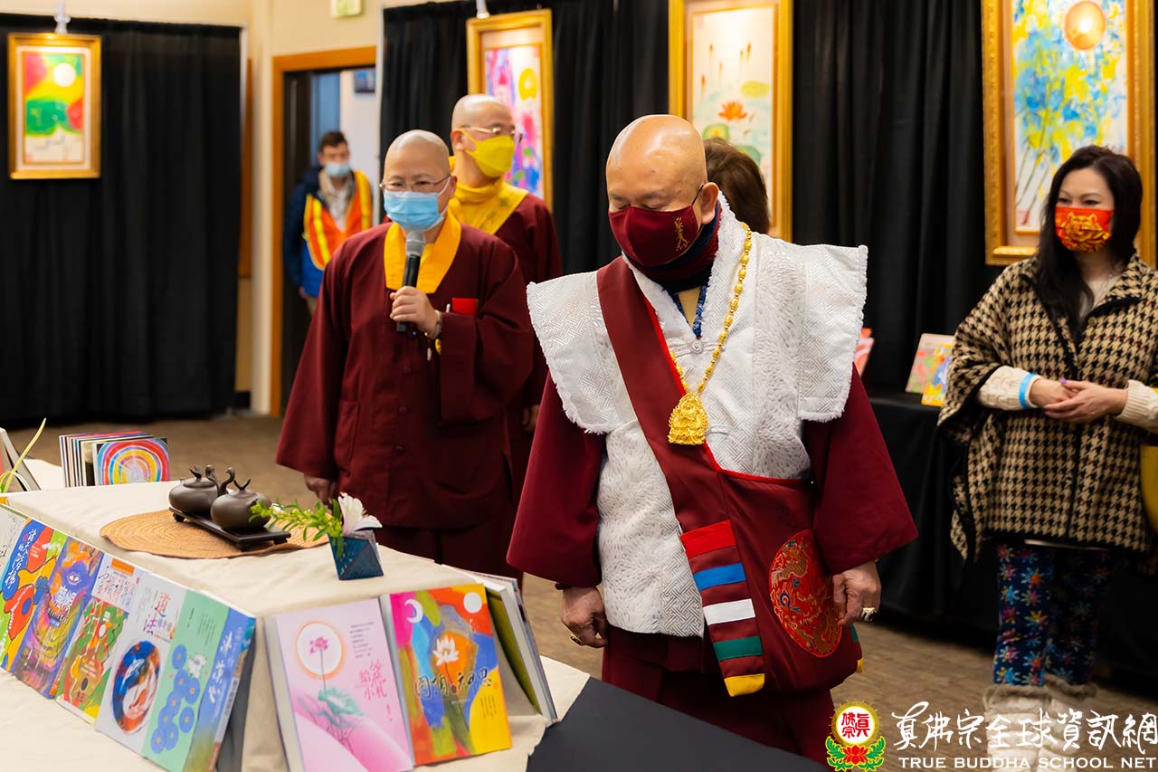 是日下午近兩點時,弟子們恭敬頂禮並以熱烈掌聲迎接法王聖尊蓮生活佛蒞臨法會現場。聖尊加持往生位、延生位以及大悲咒水,接著參觀由真佛般若藏設置的「曙光藝術畫展」。聖尊筆墨弘法52年,文章畫作富含智慧與加持,慈佑眾生。當日展出部分珍藏墨寶畫作及以畫作翻新封面之著作文集,幅幅皆引人入勝,令人大飽眼福。宗委會亦設有功德總會十二吉祥天女贊助方案的攤位,十二吉祥天女具有種種殊勝功德,此套精品更特以聖尊的髮舍利摻入天女髮際。聖尊一一參觀各個攤位,慈悲賜予加持。