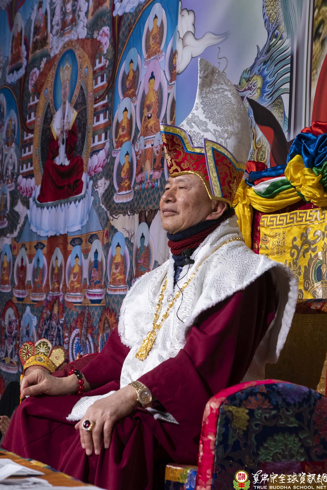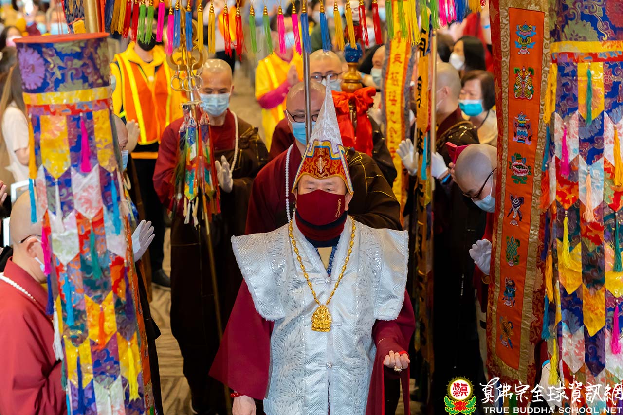 大眾虔心合掌唱誦蓮花童子心咒,莊嚴的迎師隊伍手持法器、佛幡,以鮮花撒地迎請真佛宗創辦人—法王聖尊蓮生活佛昇登法座傳授密法。