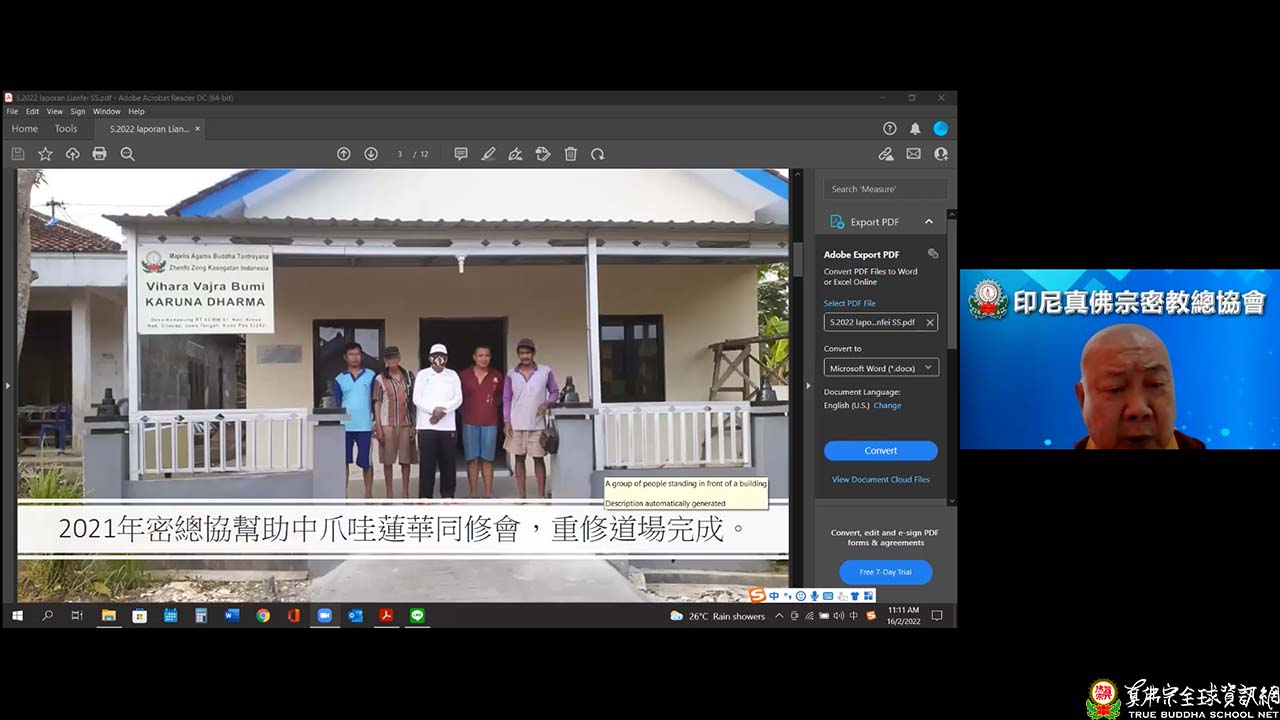 印尼密教總協會釋蓮飛上師特別在會中報告印尼地區法務發展近況,蓮飛上師提到印尼的鄉村道場共有25座,主要是分布在中爪哇,都為獨立式瓦房,特點是同門人數很多,每隔幾年,印尼密教總協會就會輪流給鄉村道場協助重新整修,2021年協助了德法同修會、蓮華同修會重修完成。