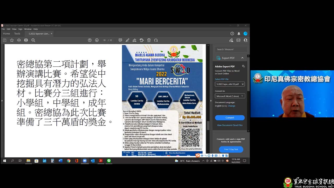 第二項計畫則是舉辦雲端演講比賽,希望從中挖掘具有潛力的弘法人才。比賽分為小學組、中學組、成年組三組進行,印尼密教總協會亦提撥了三千萬盾印尼幣作為此次比賽的獎金,同時也是提供舞台讓印尼青年們有所發揮之處。
