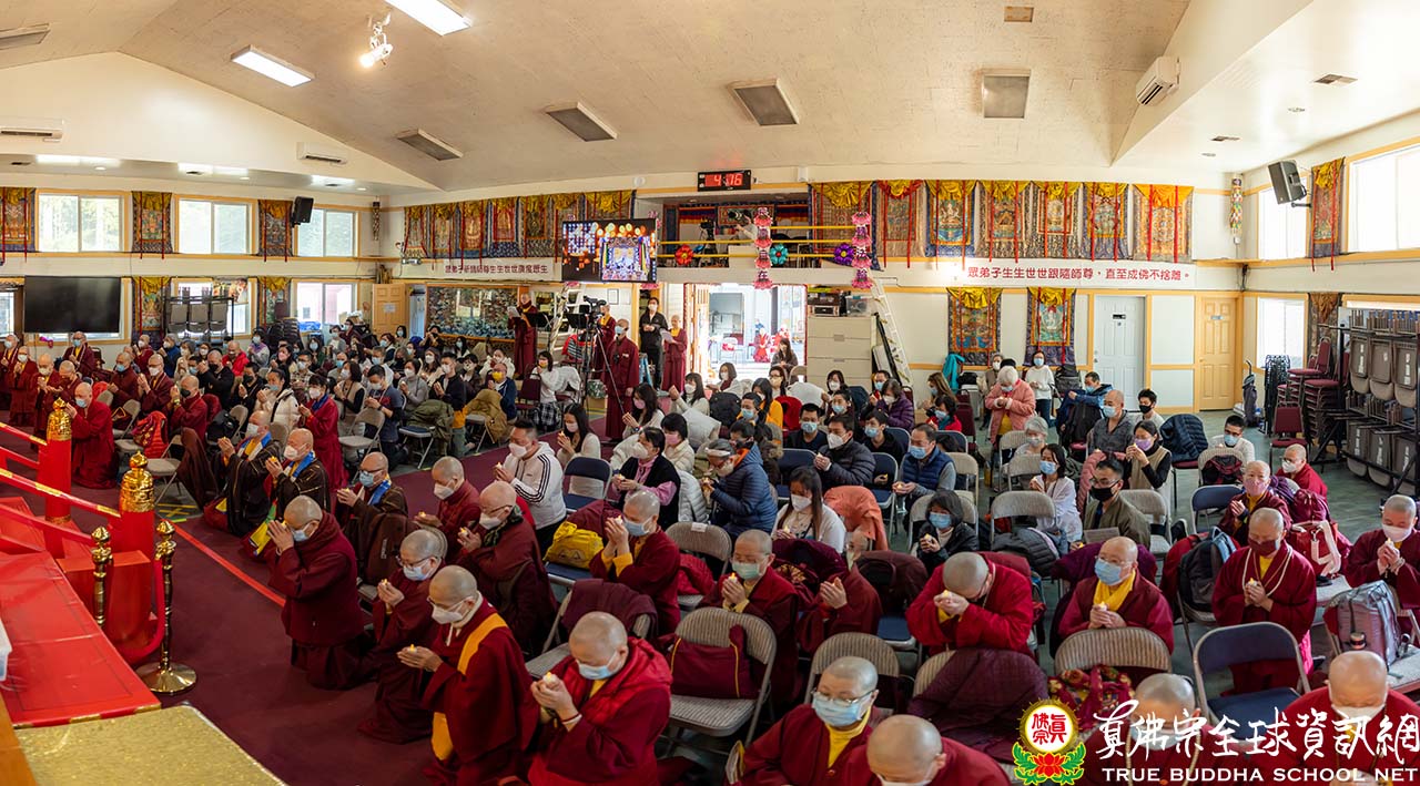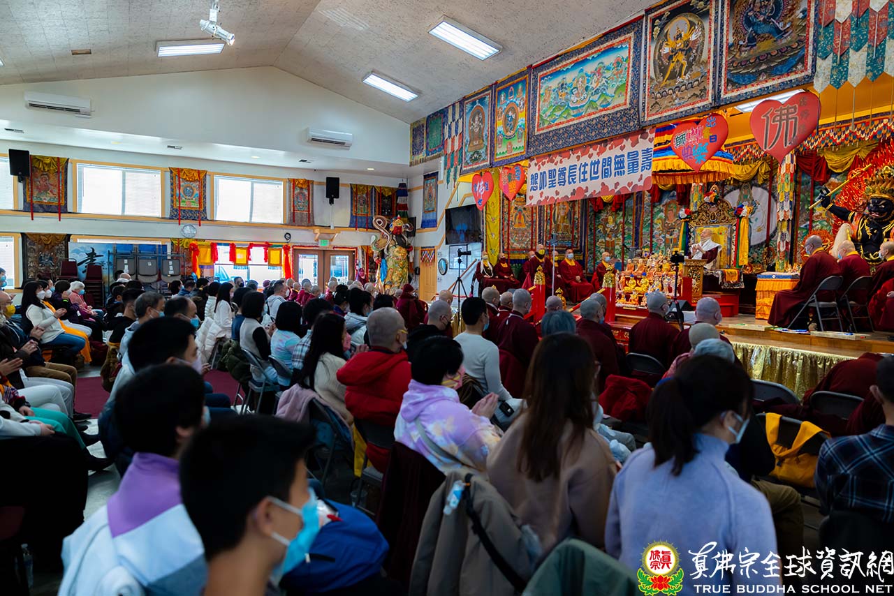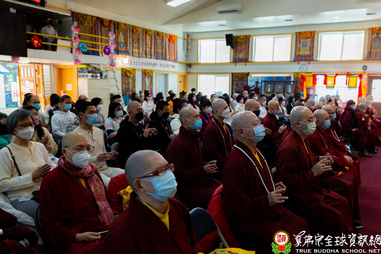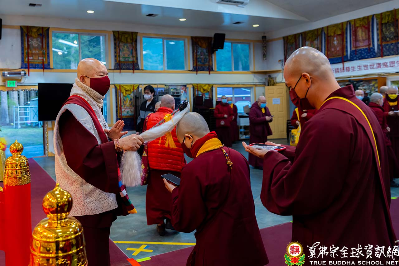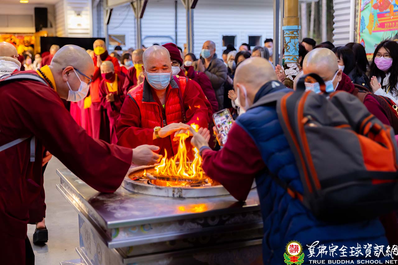 護摩結束後,請佛住世的點燈儀式開始,由宗委會、彩虹雷藏寺、西雅圖雷藏寺代表敬獻哈達及供養以表最崇高的敬意,全體弟子長跪合掌,司儀以動人的聲音說出了弟子們的心聲:法王是明燈照亮了世間、照亮了弟子們的慧命,是世間最溫暖慈悲的撫慰,是夜空中最明亮的星,指引眾生開悟得解脫。法王的大日光明點亮了弟子們心裡的那一盞燈,弟子們願以一己的螢燭之光,齊聚成為皓月之明,祈願這希望的光明能照見弟子們再三的請佛住世之心。