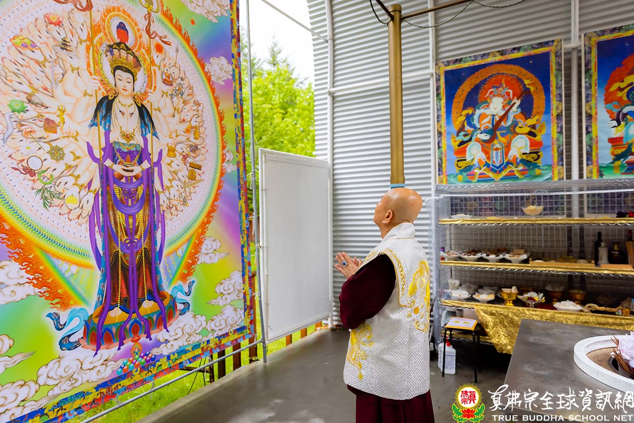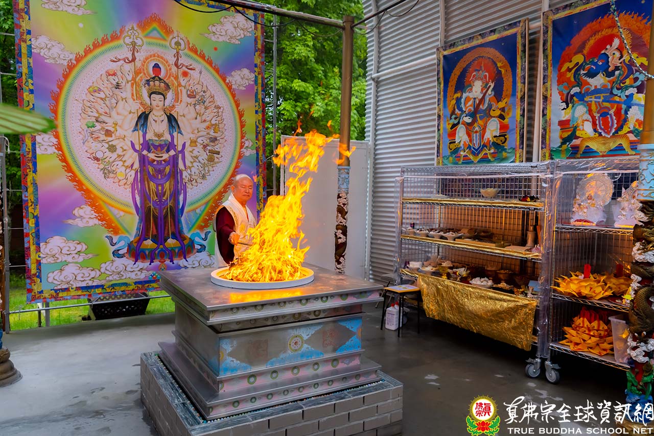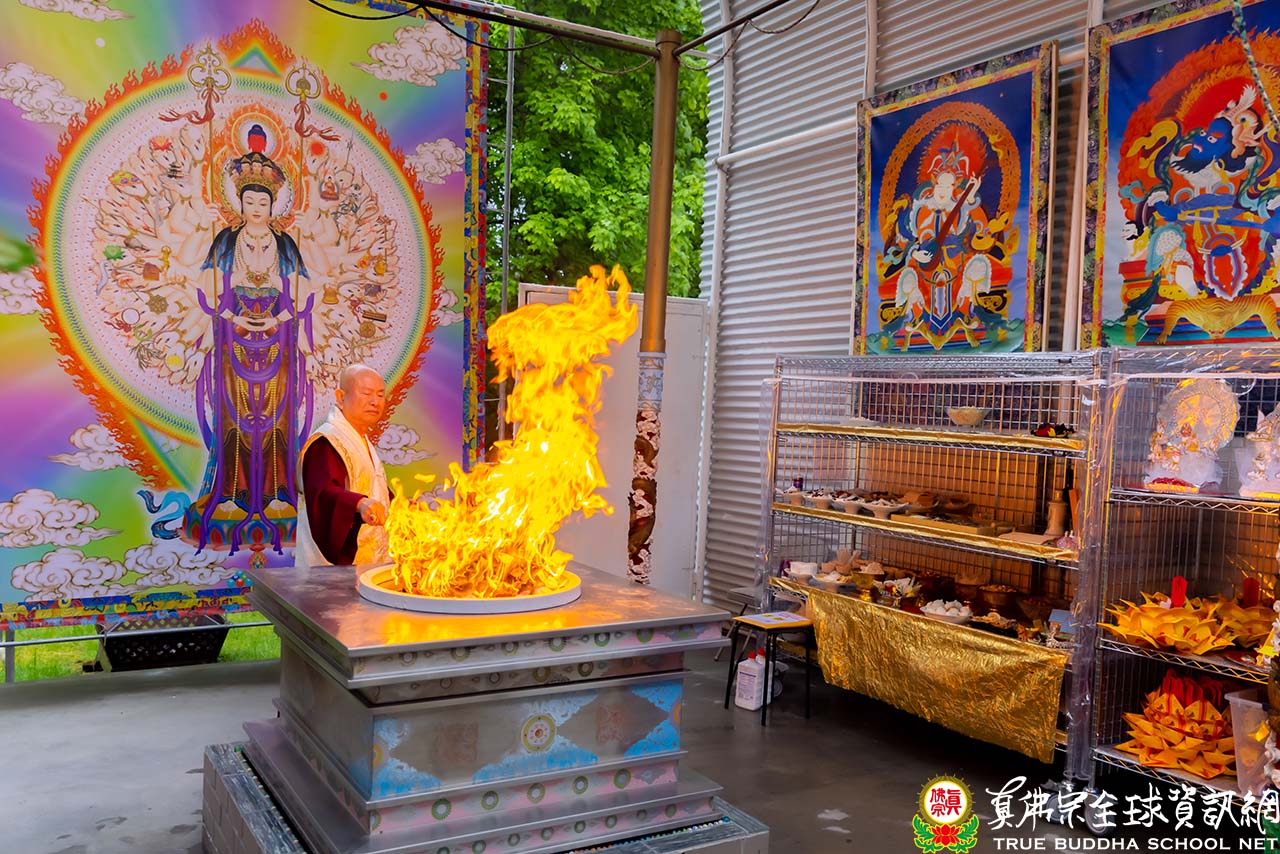 隨後,法王開示當日護摩主尊「千手千眼觀世音菩薩」總攝五部——佛部、蓮花部、金剛部、寶部及羯摩部。法王也提到有一次在凌晨兩點至三點時修法,由於太疲倦而陷入睡眠中。當法王睜開眼睛,映入眼簾的是千手千眼觀世音菩薩利用祂的千手牽著千艘法船,等待法王醒來。法王心中盡是感激,同時也請千手千眼觀世音菩薩將這千艘法船送至西方極樂世界——阿彌陀佛的淨土。法王更提到千艘法船超度中,千手千眼觀世音菩薩是最常出現,常有靈感,除了總攝五部,息災、增益、敬愛、降伏皆能圓滿。