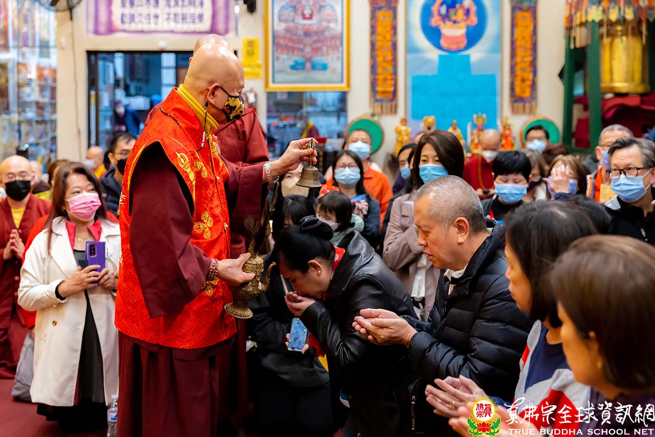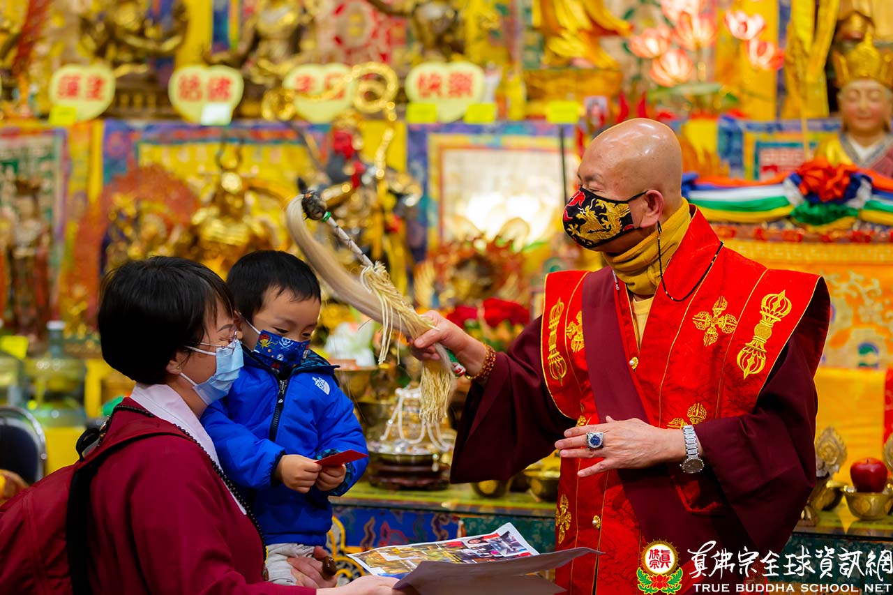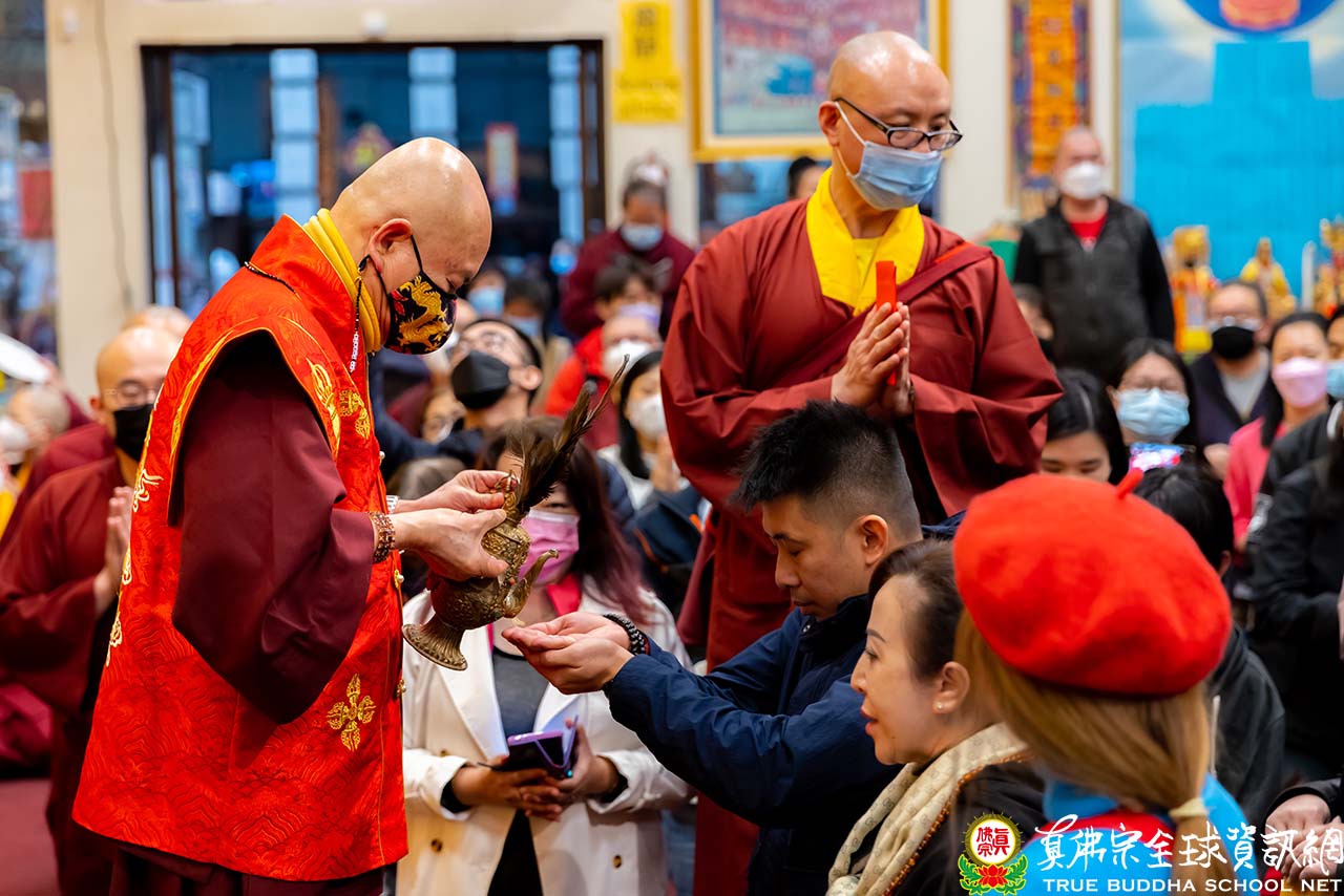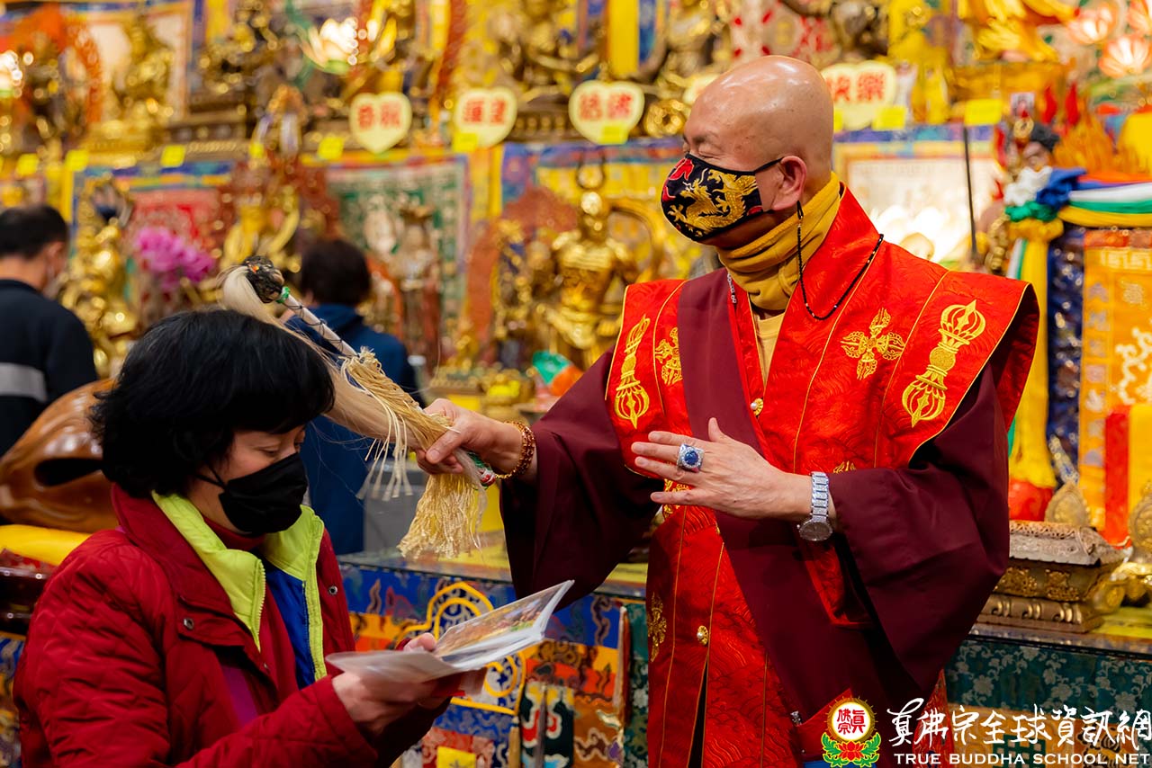 精彩寶貴的法語開示後,聖尊慈悲賜授新同門皈依灌頂、加持大悲咒水暨開光佛像,並以拂塵一一加持眾人。